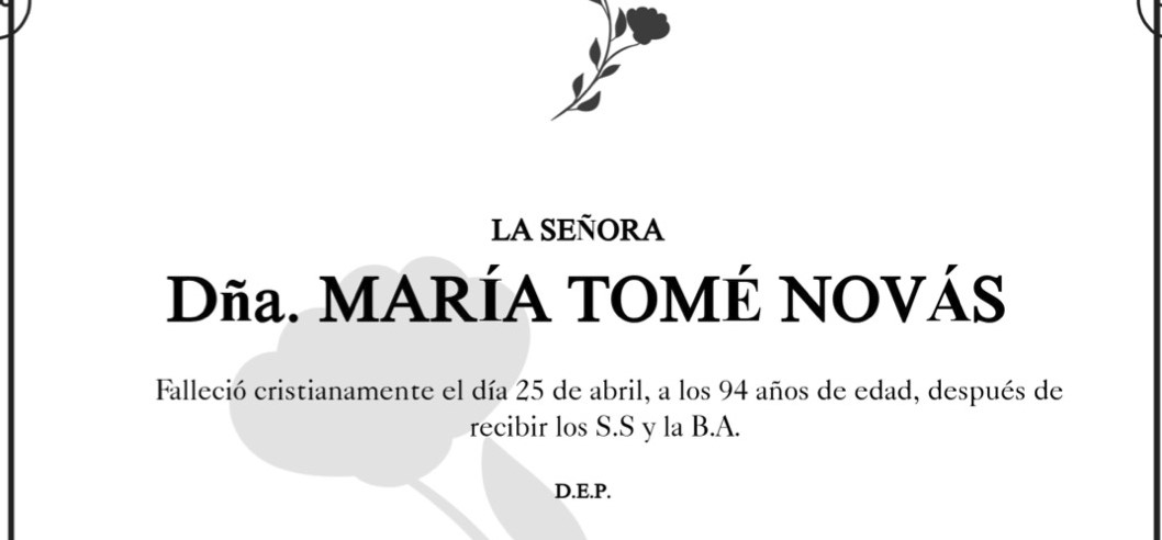 La funeraria SAN MARCOS comunica el fallecimiento HOY, día 25 de abril de doña MARÍA TOMÉ NOVAS cuyos restos mortales permanecerán en el ...