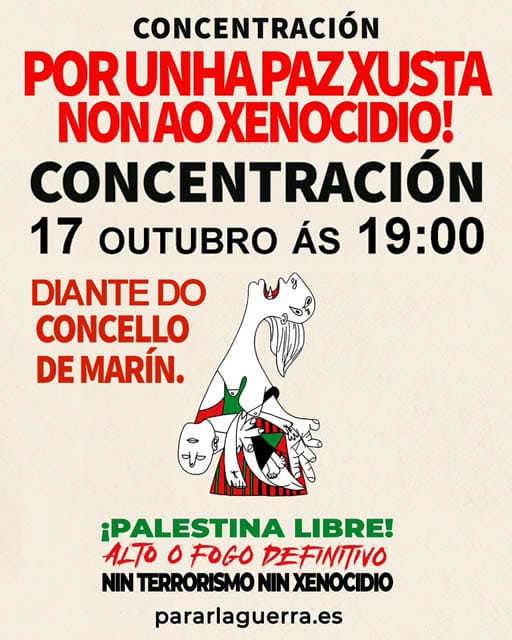 Chamamos a todas as organizacións, entidades e cidadanía en xeral a saír á ría o 17 de outubro ás 19h diante do concello de Marín para conseguir unha paz xusta e duradeira na que o rexeitamento ó xenocidio sexa un clamor que una sen distinción de ideoloxías, credos ou siglas.