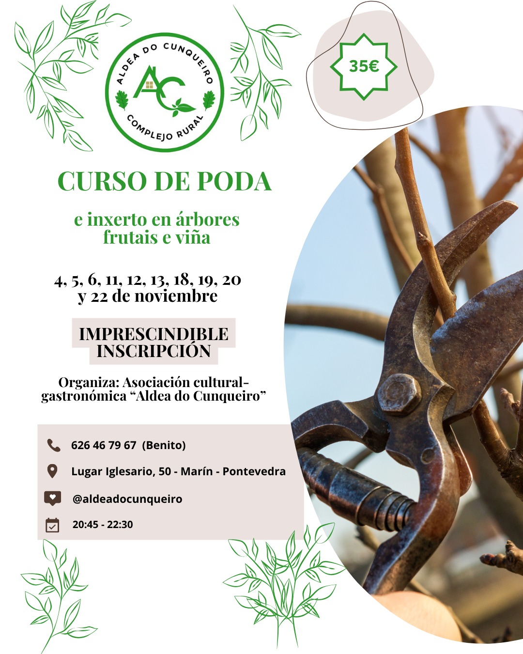 E para dar a coñecer o segredo e a práctica do inxerto, a “Asociación Cultural e Gastrónómica Aldea do Cunqueiro” anuncia a posta en marcha no iglesari de Santomé, dun curso intensivo entre os días 4 e 22 de novembro para todos os interesados en adquirir os coñecementos e a práctica desta maneira de mellorar o rendemento dos frutais e da vide.