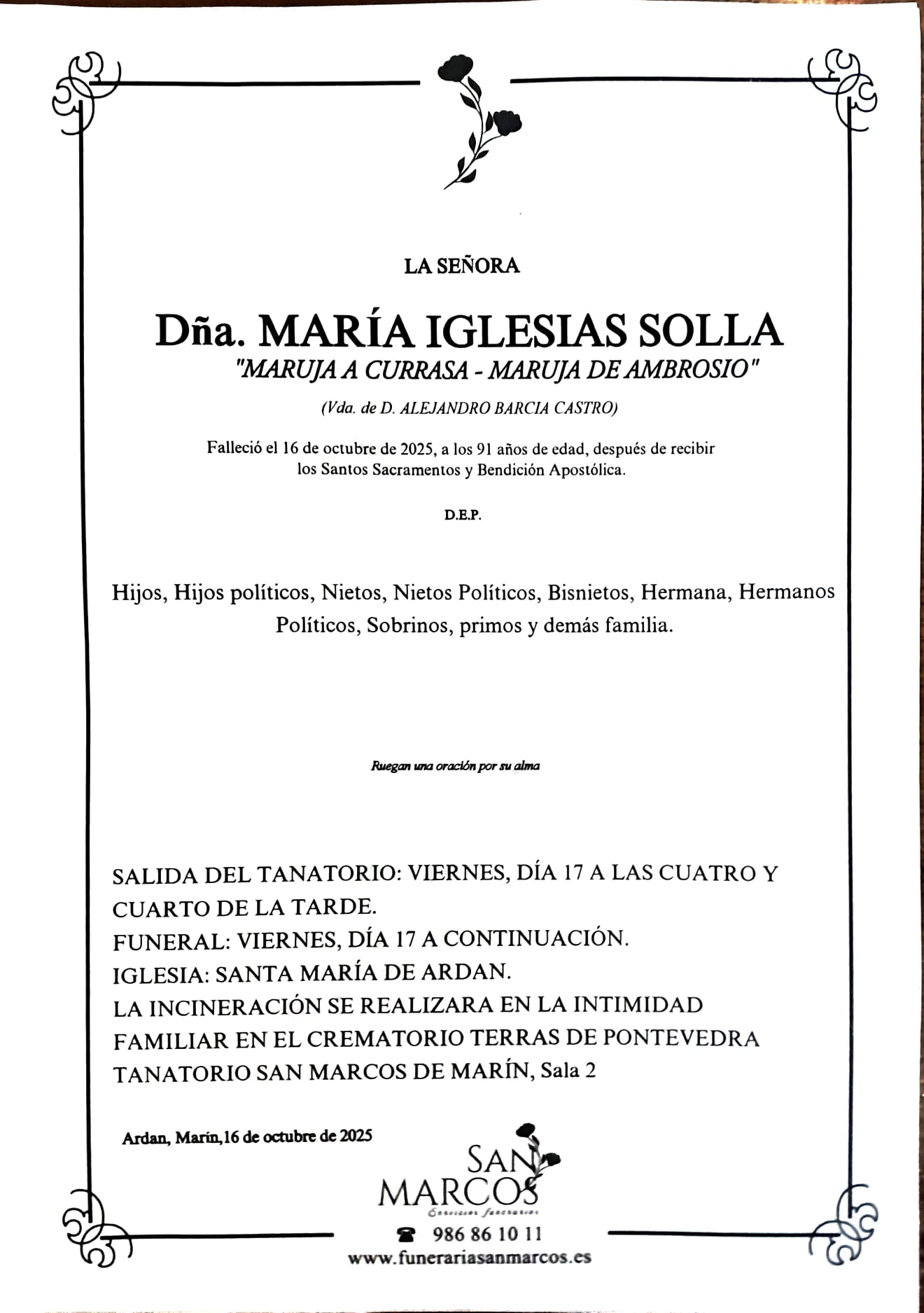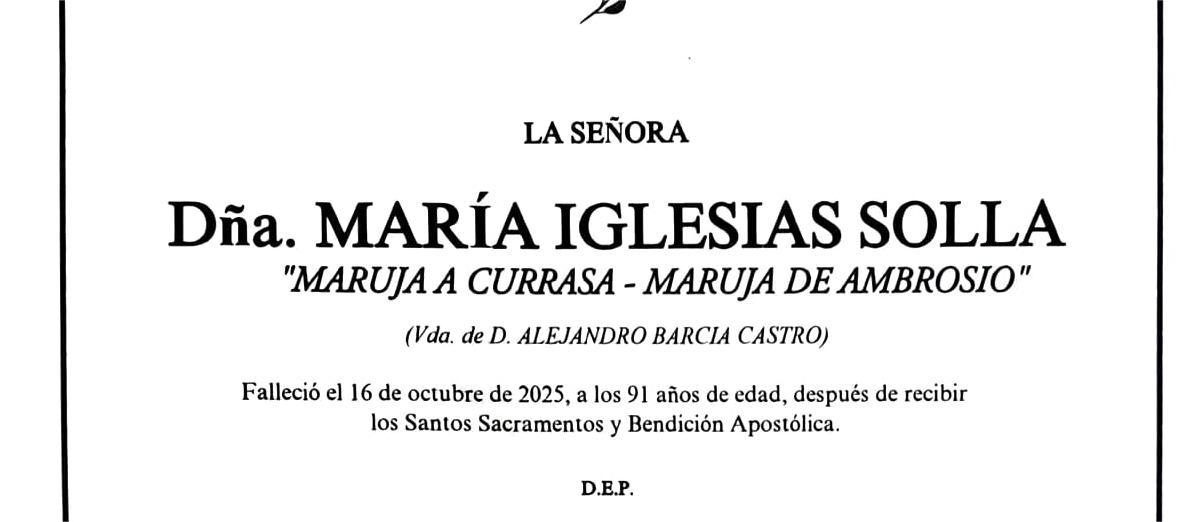 La funeraria SAN MARCOS comunica el fallecimiento de Doña MARÍA IGLESIAS SOLLA, cuyos restos mortales permanecerán en el tanatorio San Marcos de Marín, sala número 2, hasta el momento de su traslado, mañana viernes, día 17, a las cuatro y cuarto de la tarde a la iglesia parroquial de Santa María de Ardán donde, a continuación, tendrá lugar el funeral por su alma.