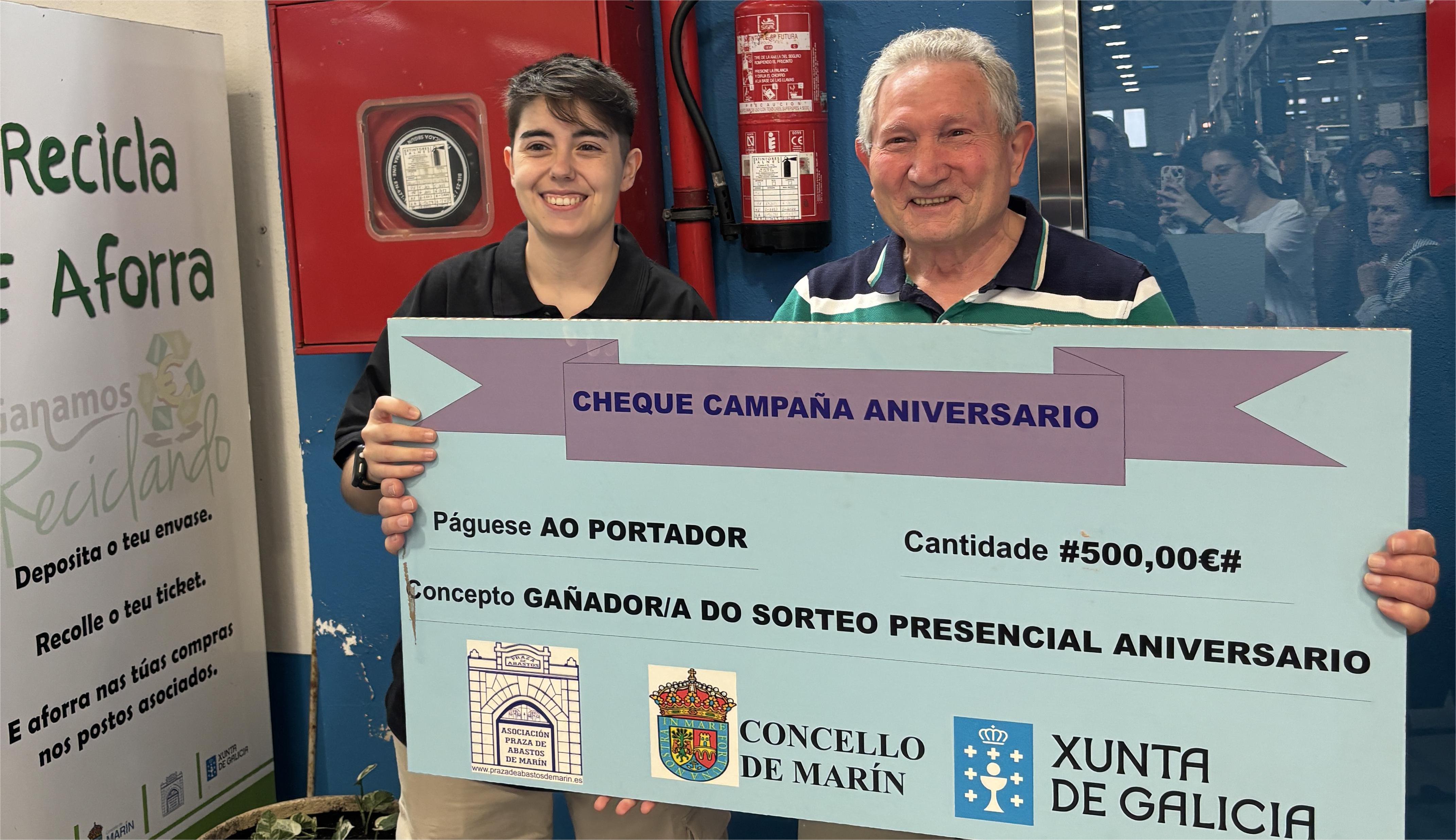 La Asociación de Comerciantes de la Plaza e Abastos de Marín hizo entrega del premio de un vale de 500 euros sorteado entre sus compradores como conmemoración del 18 aniversario de la reinauguración del mercado municipal.