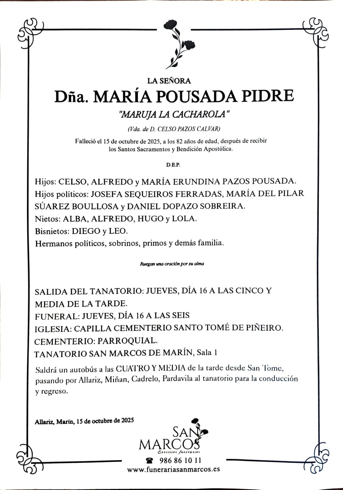 La funeraria SAN MARCOS comunica el fallecimiento de Doña MARÍA POUSADA PIDRE, cuyos restos mortales permanecerán en el tanatorio San Marcos de Marín, sala número 1, hasta el momento de su traslado, mañana jueves, día 16, a las cinco y media de la tarde al cementerio parroquial de Santo Tomé de Piñeiro para su inhumación.
