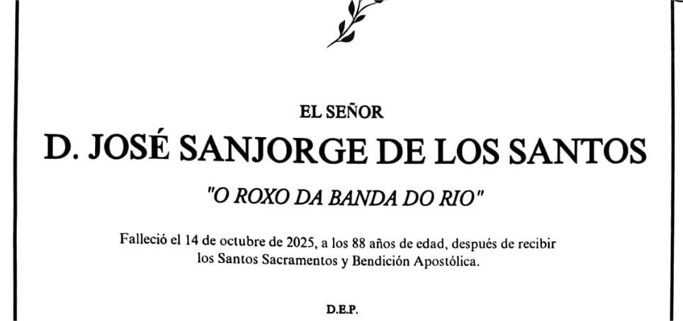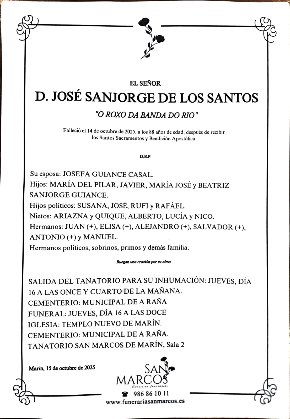 La funeraria SAN MARCOS comunica el fallecimiento de Don JOSÉ SANJORGE DE LOS SANTOS, cuyos restos mortales permanecerán en el tanatorio San Marcos de Marín, sala número 2, hasta el momento de su traslado, mañana jueves, día 16, a las once y cuarto de la mañana al cementerio municipal de A Raña para su inhumación.