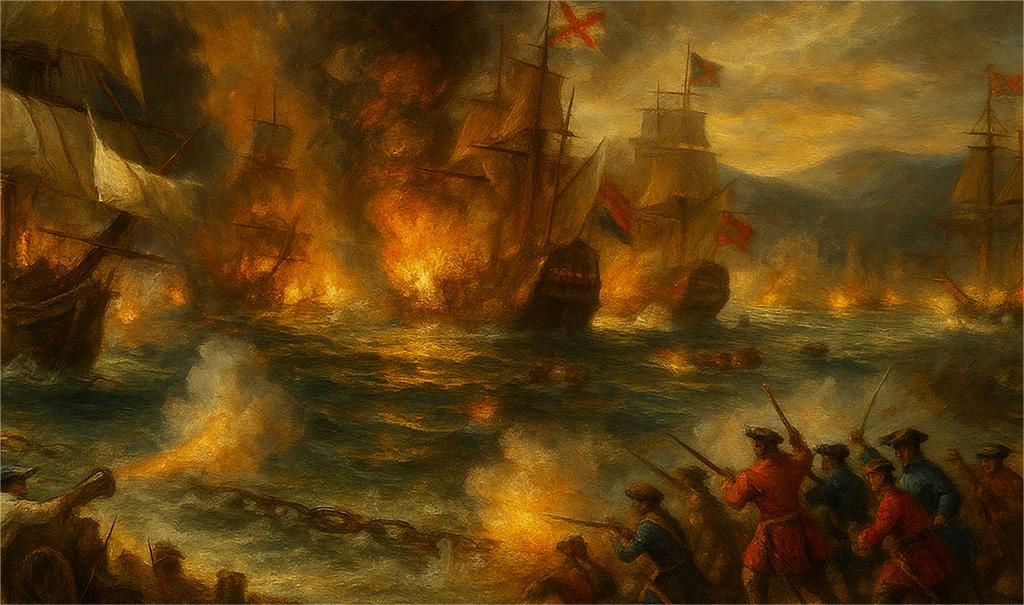 Empezamos esta semana allá por 1700 cuando fallece el rey Carlos II sin descendencia, comenzó una lucha por el poder, que , sin entrar en profundidades, acabó en la guerra de Sucesión, fomentada por otras potencias extranjeras, por un bando una alianza anglo-holandesa principalmente y franco-española con el papado en menor medida, por otro lado. Esto nos toca porque, unos 150 navios anglo-holandeses, después de ser rechazados en una batalla en Cádiz, y regresando al norte, tienen noticia de que unos galeones cargados de plata están llegando a costas españolas.