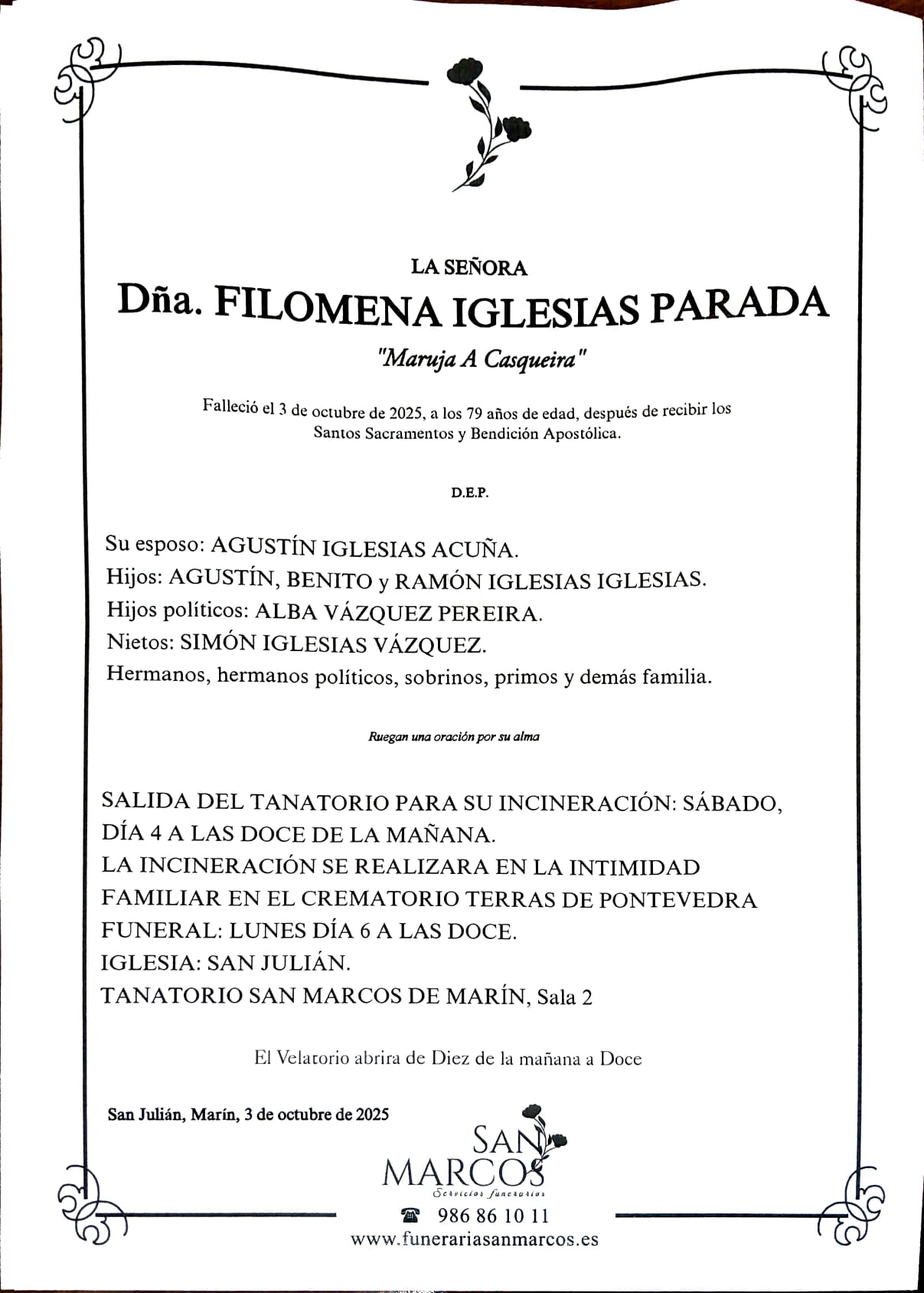 La funeraria SAN MARCOS comunica el fallecimiento de Doña FILOMENA IGLESIAS PARADA, cuyos restos mortales permanecerán en el tanatorio San Marcos de Marín, sala número 2, hasta el momento de su traslado, mañana SÁBADO día 4, a las DOCE de la mañana al crematorio Terras de Pontevedra para su incineración en la intimidad familiar.