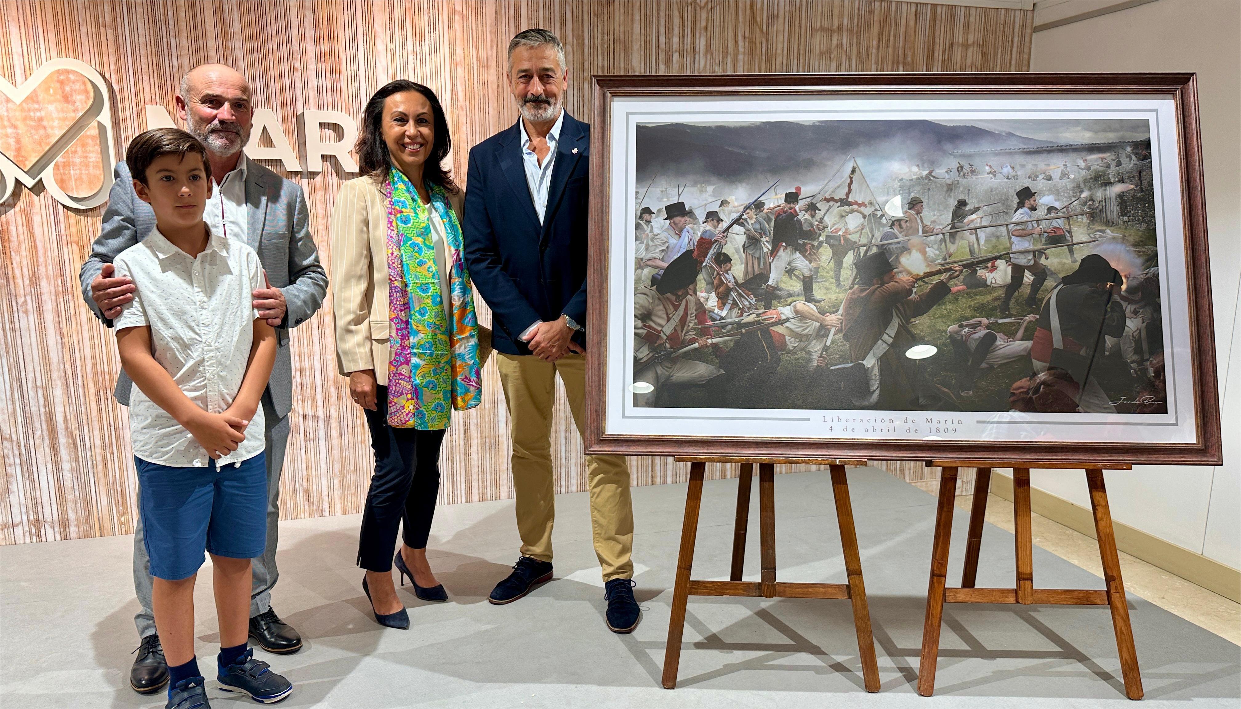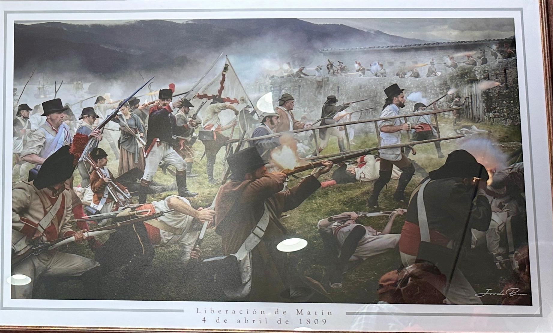 El Museo Torres recibió ayer una magnífica obra de fotocomposición que recoge el momento del asalto de las Alarmas de Morrazo al Fuerte de San Fernando para liberar Marín de los franceses el 4 de abril de 1809, obra genial de Jordi Bru que fue recibida por la alcaldesa de manos del presidente de la asociación de Vecinos de Penizas, José Iglesias