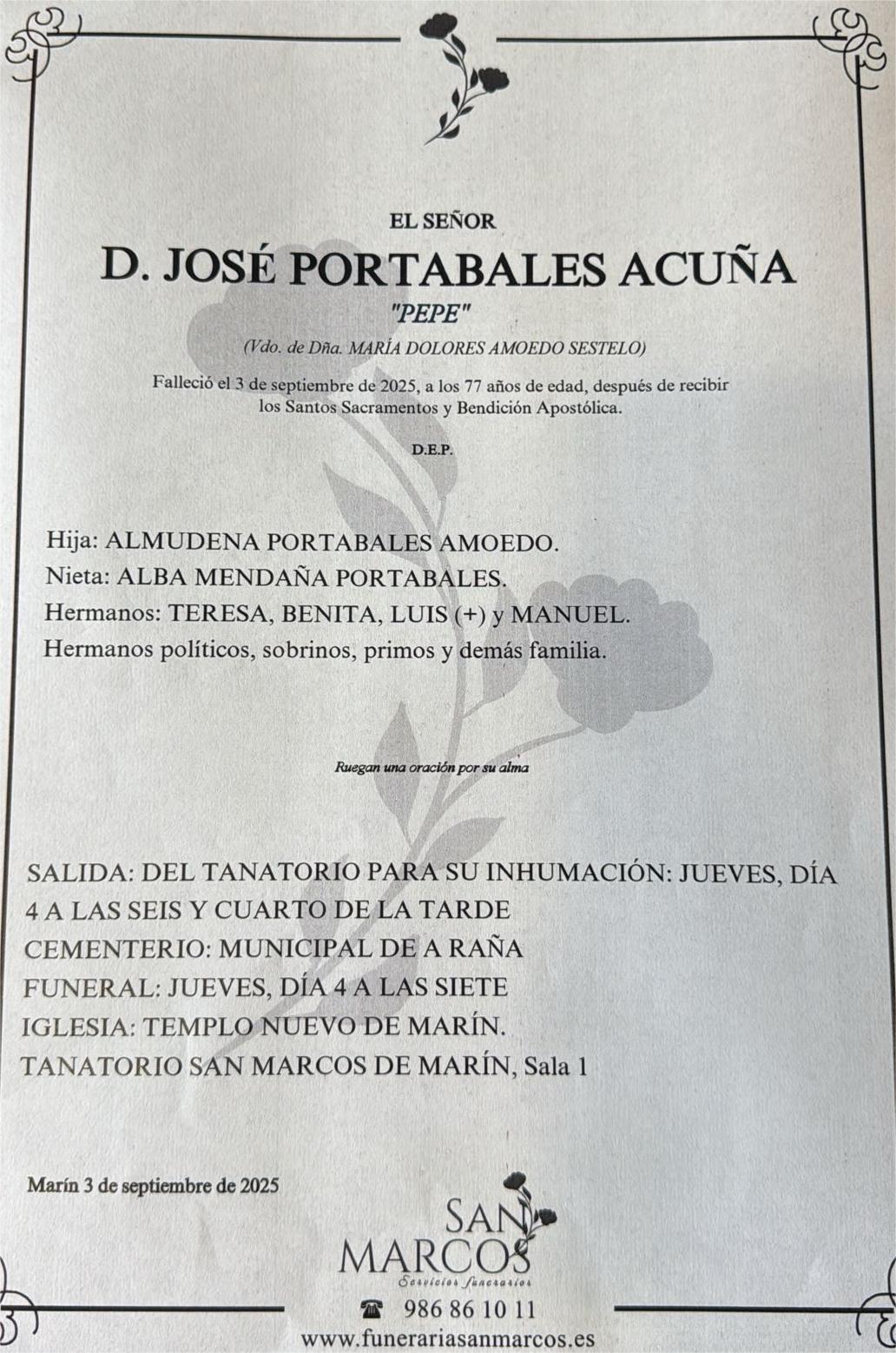 El mundo del deporte se tambalea una vez más con la desgraciada noticia del repentino fallecimiento en la mañana de hoy de uno de los jugadores de fútbol legendarios del histórico Marín C.F., José Portabales Acuña (Pepe Portabales), que formó parte del Marín C.F. en tres etapas entre los años 1965 y 1983, ya que en temporadas intermedias fue fichado por importantes equipos del fútbol gallego.