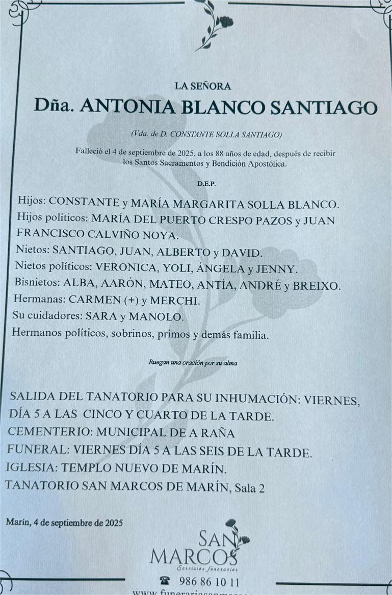La funeraria SAN MARCOS comunica el fallecimiento de Dña. ANTONIA BLANCO SANTIAGO, cuyos restos mortales permanecerán en su tanatorio de Marín, sala número 2, hasta el momento de su traslado, mañana VIERNES día 5 a las cinco y cuarto de la trarde, al cementerio municipal de A Raña para su inhumación.