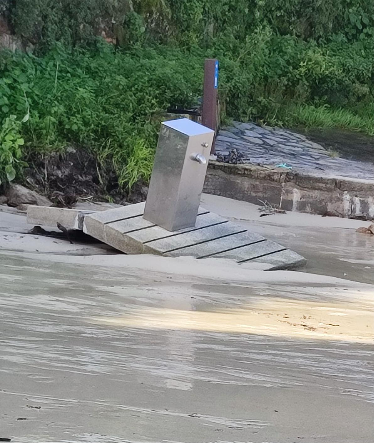 La segunda, en la misma playa, los desperfectos ocasionados por el temporal en uno de los “lavapiés” que los servicios municipales tendrán que recolocar adecuadamente para que cumpla su misión.