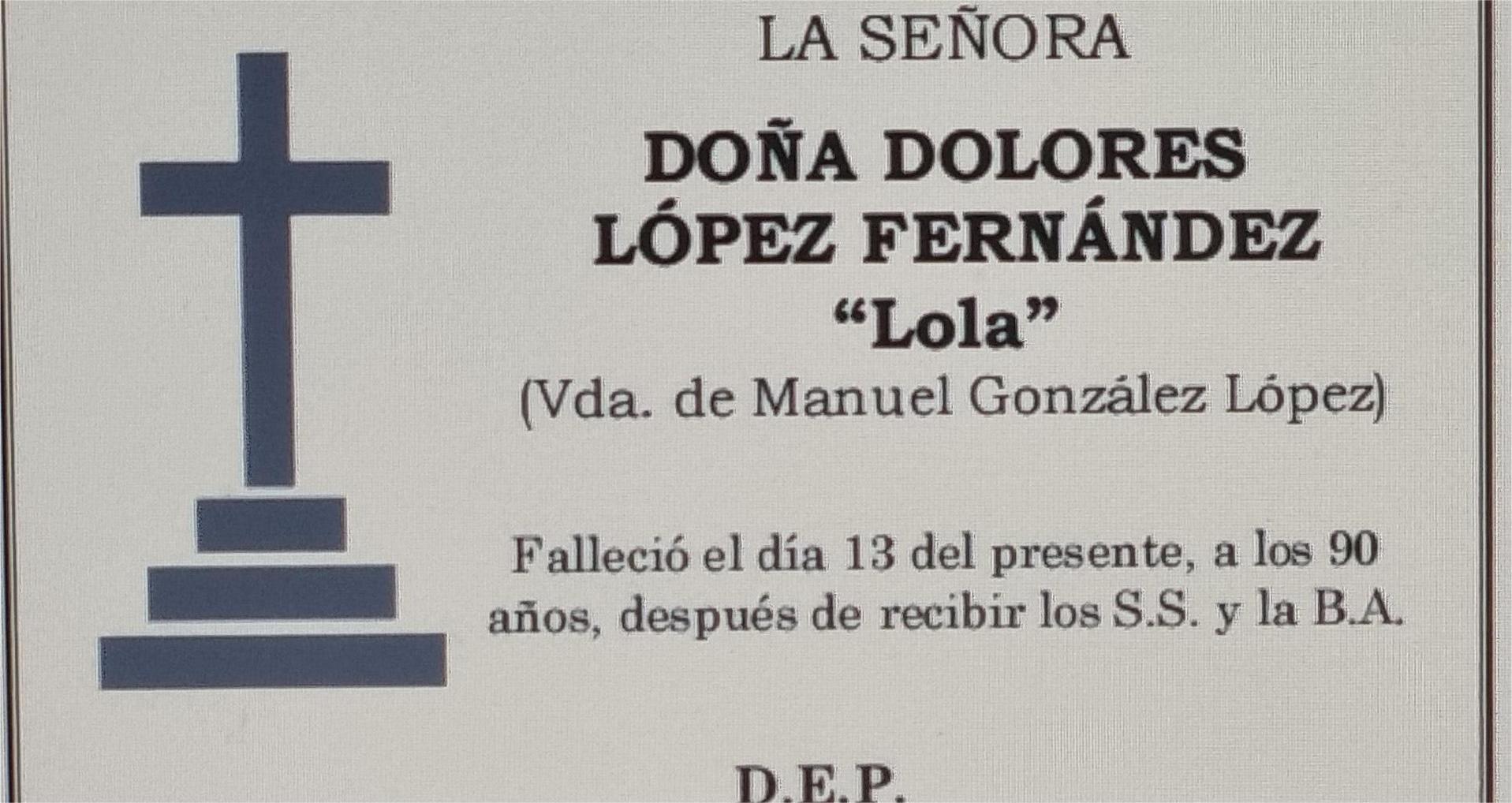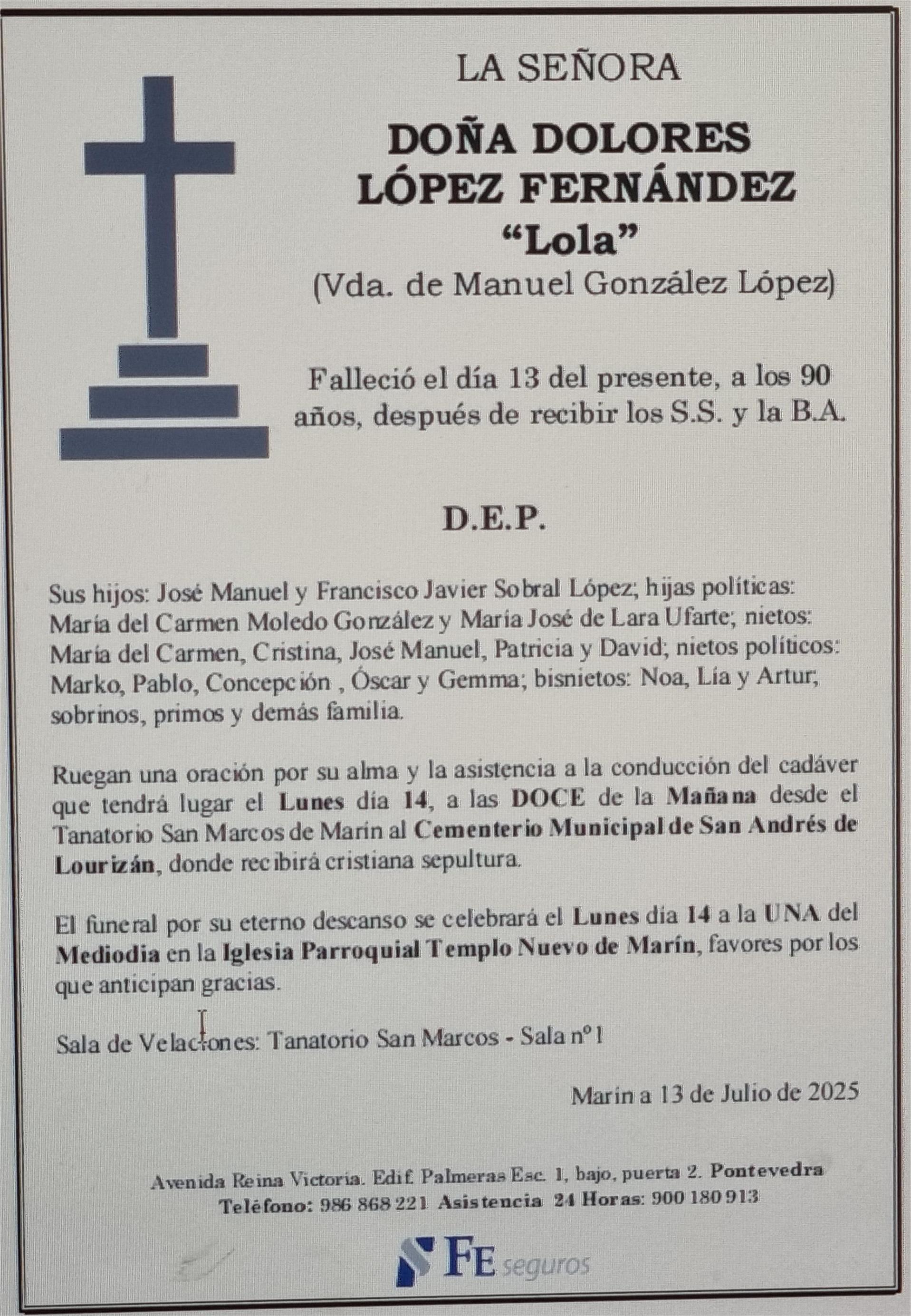 La funeraria LA FE comunica el fallecimiento hoy, día 13 de julio, de doña DOLORES LÓPEZ FERNÁNDEZ cuyos restos mortales permanecerán en el Tanatorio San Marcos de Marín, sala nº 1, hasta el momento de su traslado, MAÑANA lunes día 14 de julio, a las DOCE del mediodía al Cementerio Municipal de San Andrés de Lourizán para su inhumación en cristiana sepultura