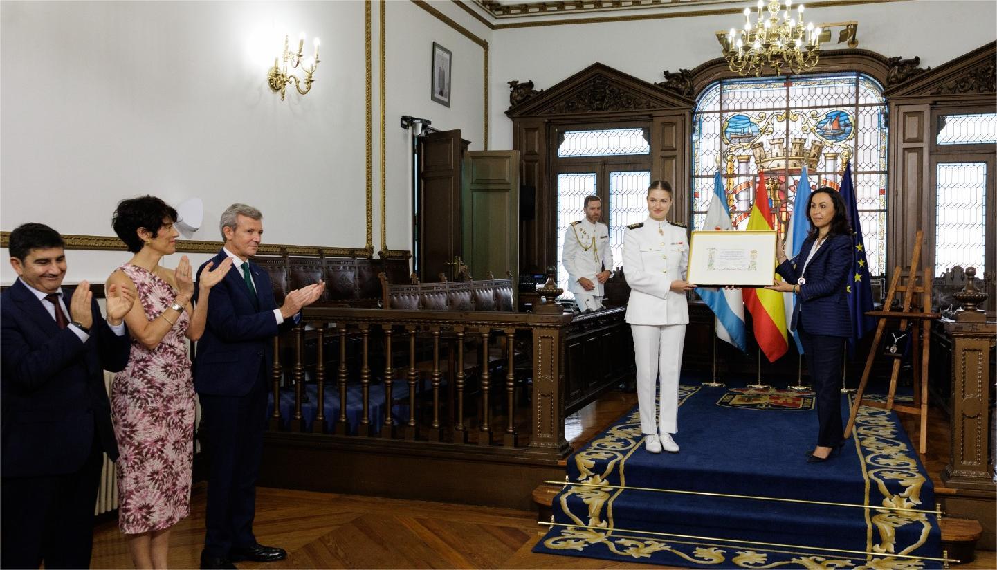 Ya en el salón de Plenos del Concello, Doña Leonor, en presencia de la Corporación Municipal y del Presidente de la Xunta de Galicia, entre otras autoridades, escuchó el texto del acuerdo municipal por el que se acordaba en el pleno de diciembre de 2024, el nombramiento como Hija Adoptiva de Marín, lectura que realizó la secretaria Municipal quien dijo “El Pleno del Ayuntamiento de Marín, en la sesión ordinaria celebrada el 12 de diciembre de 2024, aprobó la propuesta de la instructora del expediente, la Alcaldesa-Presidenta Doña María Ramallo Vázquez, y previa tramitación del procedimiento previsto en el el Reglamento municipal para la concesión de honores y distinciones, de nombramiento como Hija Adoptiva del Ilmo. Ayuntamiento de Marín a S.A.R. doña Leonor de Borbón y Ortiz” .