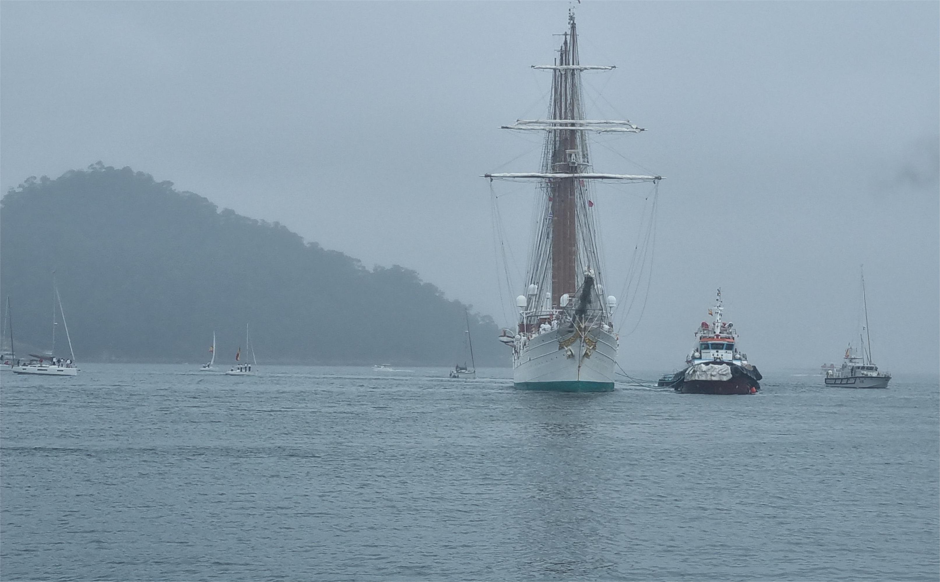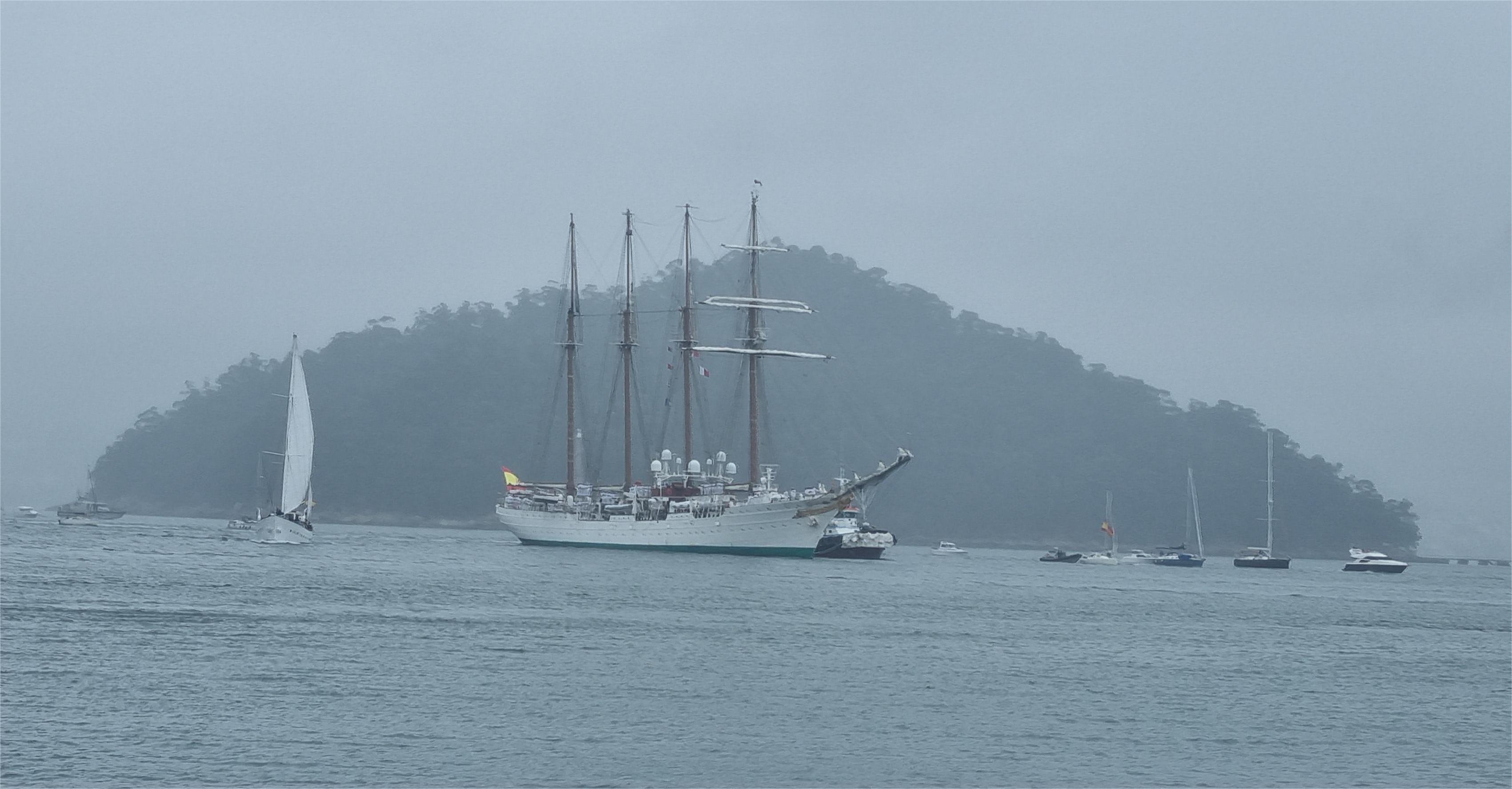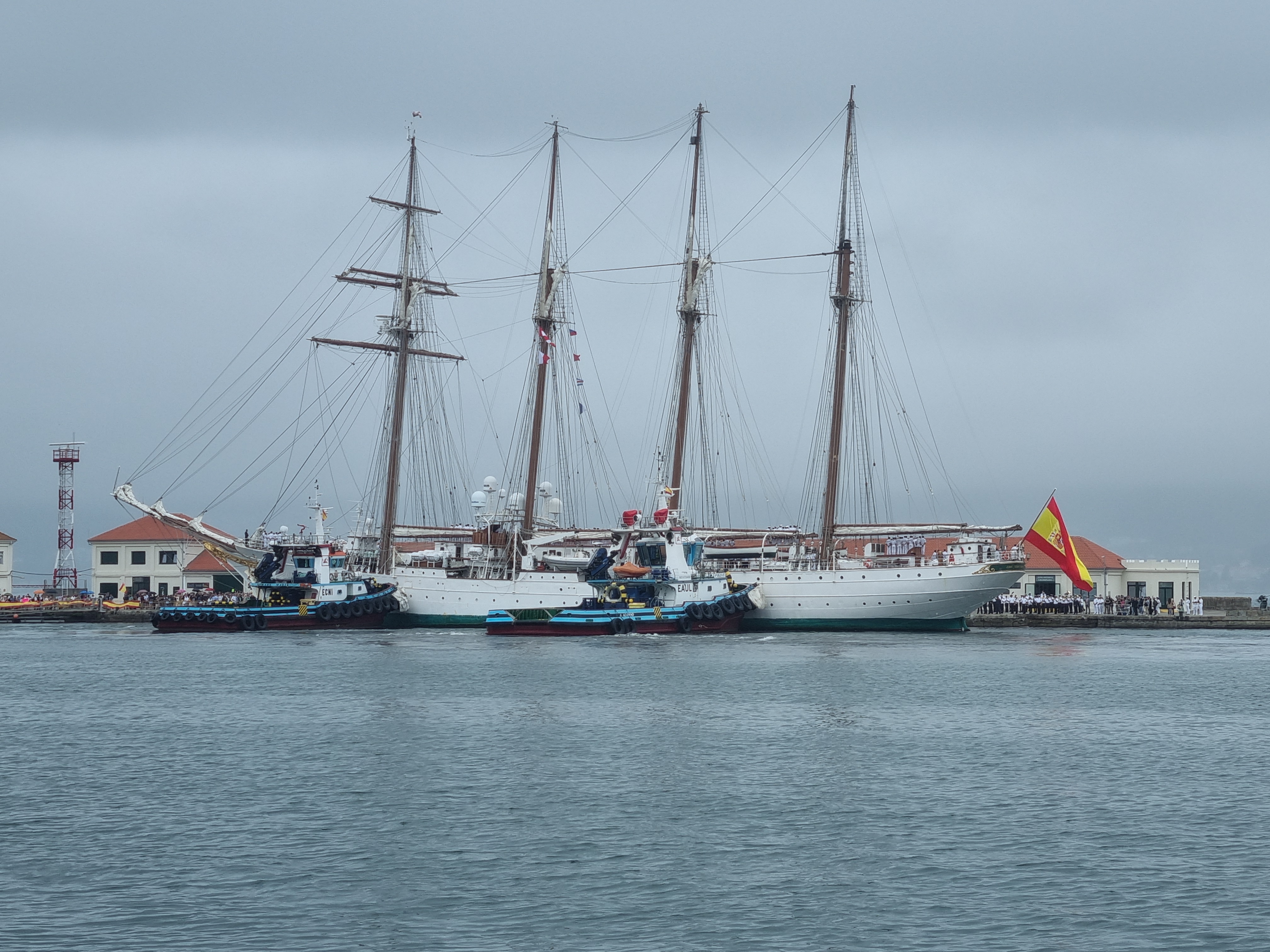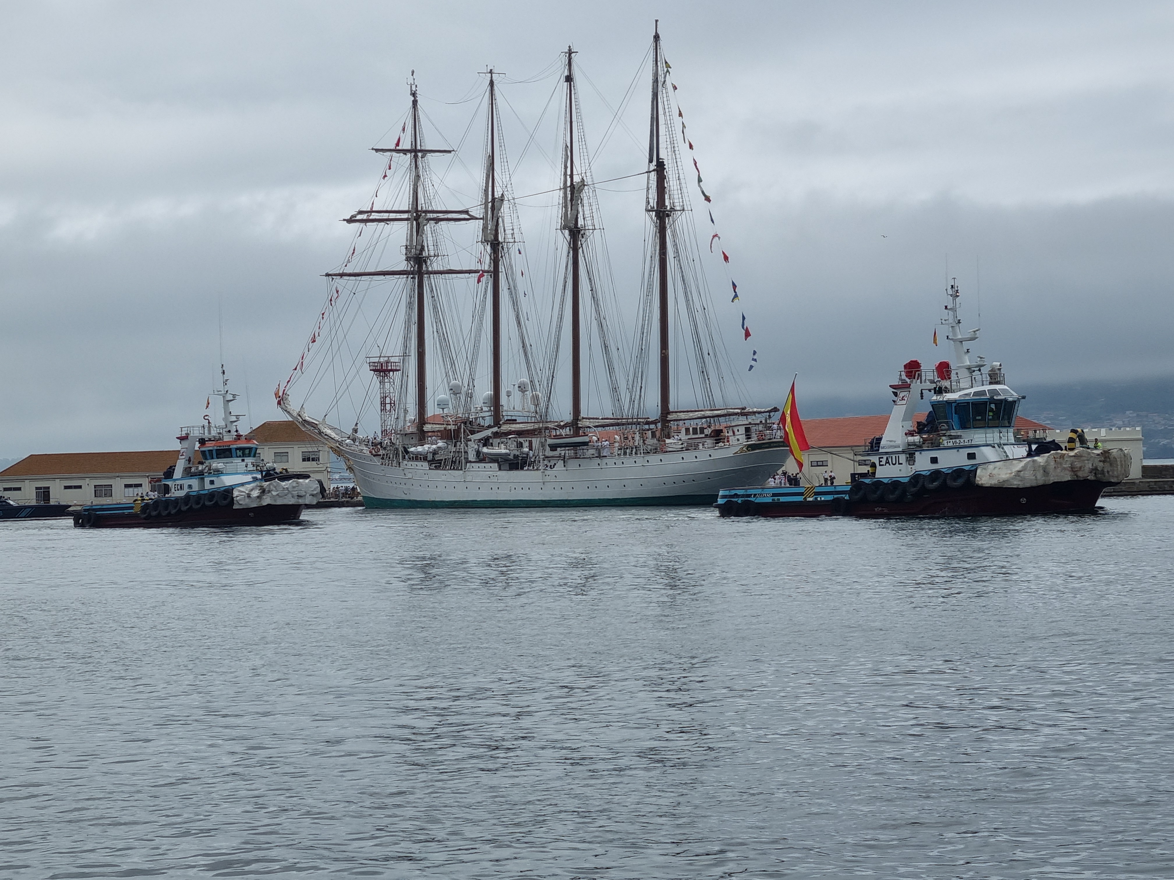 Los cuatro palos empezaron a verse, en una tarde de color gris plomizo intensificado en el momento de la maniobra, tras el muelle de torpedos y el barco, tras pasar frente a la isla de Tambo, fue virando hacia el muelle de la dársena militar prácticamente de manera autómata aunque siempre con el apoyo de los remolcadores de AmareMarín que, ya al final de la maniobra
