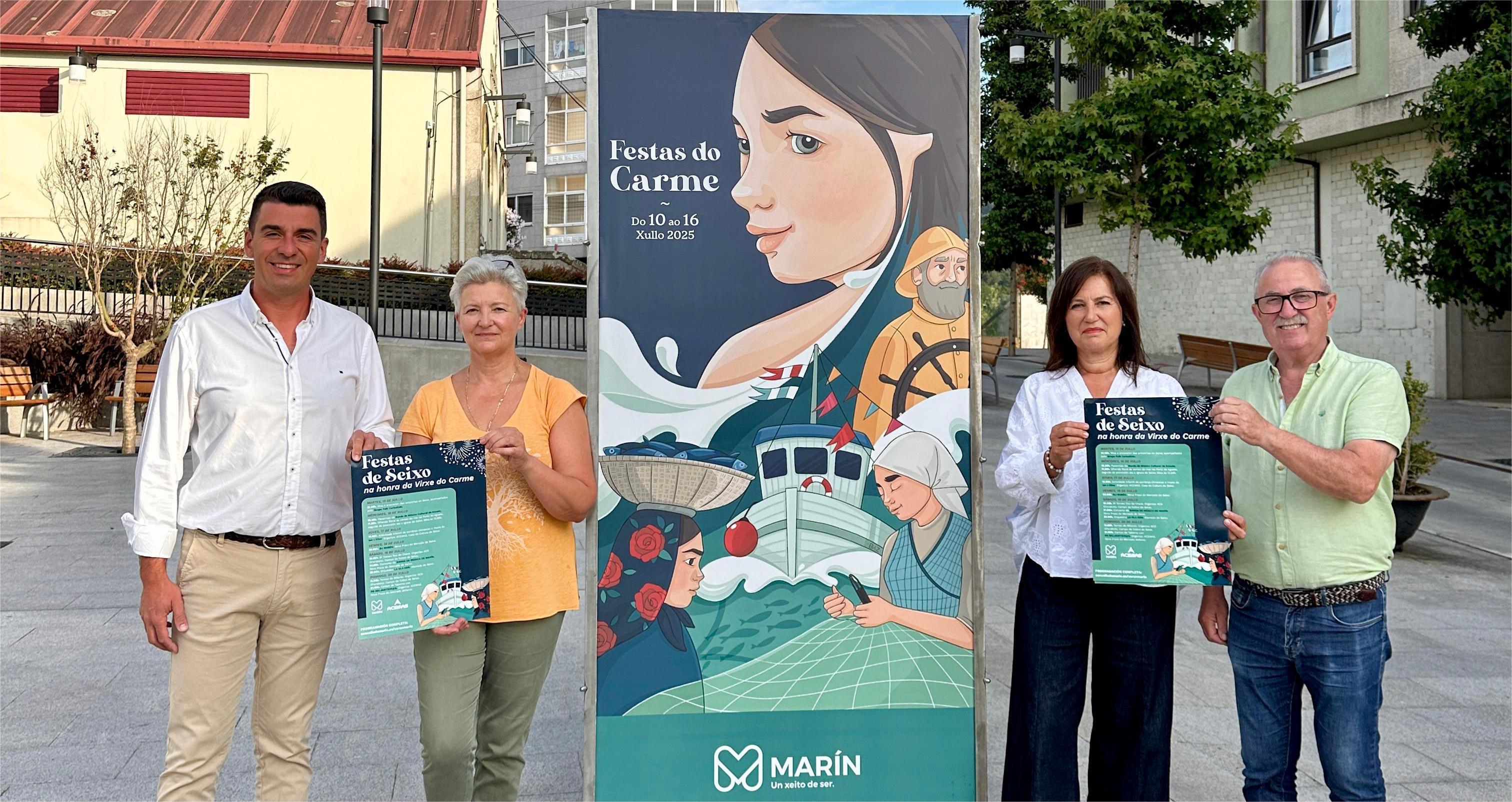 La combinación habitual Concello-Acemas anuncia el programa de las fiestas de Seixo que toman el relevo de las de Marín en general con dedicación a la Virgen del Carmen que es su Patrona. Así, Cristina Souto y Manuel Solla, de ACEMAS, junto con los concejales Cristina Acuña y Pablo Novas, hicieron acto de presentación del programa de actos que se iniciará mañana martes a las nueve y media de la noche con la “Procesión de las Antorchas” en, que se traslada la imagen de la Virgen del Carmen hasta Aguete donde pernoctará para presidir, a las 11,30 del miércoles, la ofrenda floral a las gentes del mar en el muelle de Aguete y posterior traslado procesional hacia el templo parroquial donde tendrá lugar la Misa Solemne. Por su parte, la Banda de Música realizará un pasacalles desde la gasolinera hasta el puerto a partir de las 10,30.