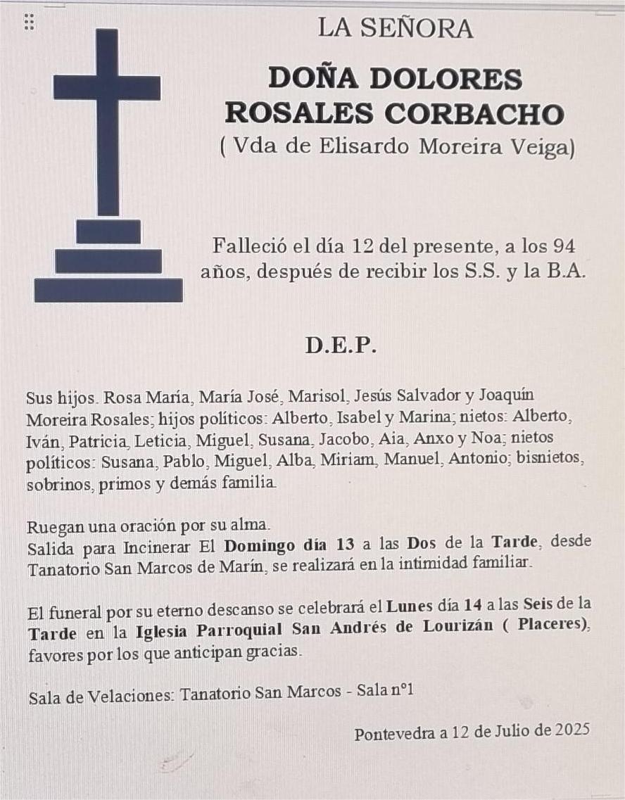 La funeraria SAN MARCOS comunica el fallecimiento hoy, día 12 de julio, de doña DOLORES ROSALES CORBACHO cuyos restos mortales permanecerán en el Tanatorio San Marcos de Marín, sala nº 1, hasta el momento de su traslado, MAÑANA domingo día 13 de julio, a las Dos de la tarde para ser incinerados en la intimidad familiar
