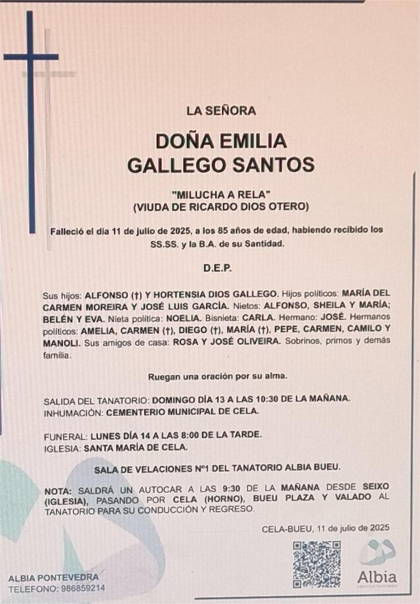 La funeraria ALBIA comunica el fallecimiento AYER, día 11 de junio, de doña EMILIA GALLEGO SANTOS cuyos restos mortales permanecerán en el Tanatorio Albia - Bueu, sala nº 1, hasta el momento de su traslado, MAÑANA domingo día 13 de julio, a las DIEZ Y MEDIA de la mañana al cementerio municipal de Cela-Bueu para su inhumación.