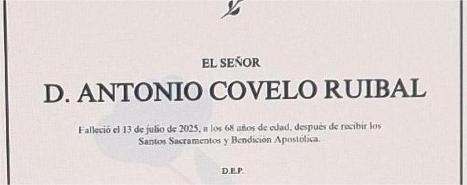La funeraria SAN MARCOS comunica el fallecimiento hoy, día 13 de julio, de don ANTONIO COVELO RUIBAL cuyos restos mortales permanecerán en el Tanatorio San Marcos de Marín, sala nº 2, hasta el momento de su traslado, MAÑANA lunes día 14 de julio, a las una del mediodía al crematorio “Terras de Pontevedra" para su incineración en en la intimidad familiar