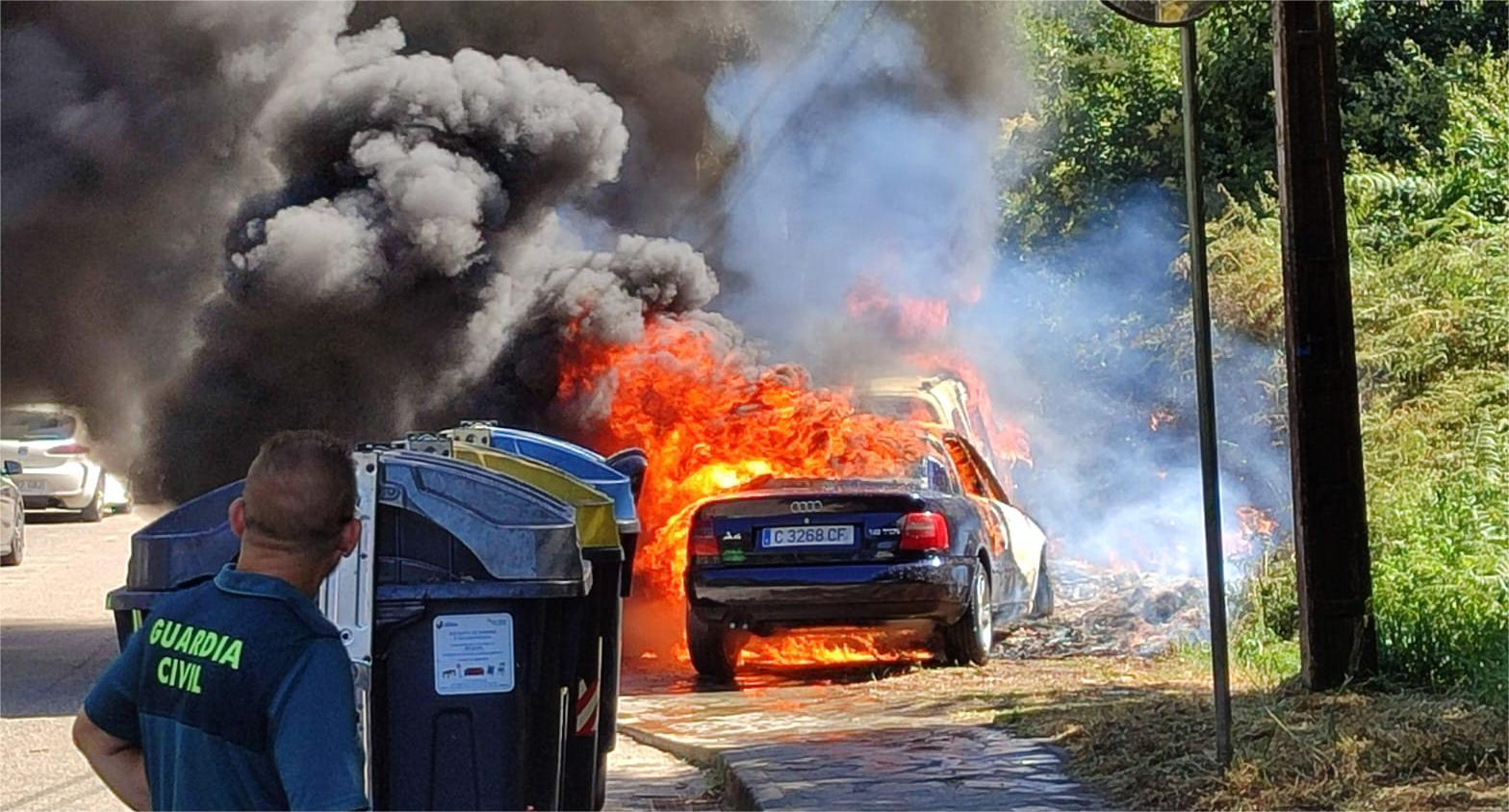 La maldición del fuego no nos deja y, tras el tremendo incendio forestal de ayer en los montes de San Xulián, ahora mismo, 17,40 de la tarde, tenemos que informar lamentablemente de otro suceso, esta vez en el Vial de Playas donde, al menos dos vehículos, un Citroën Berlingo y un Audi A4, que se encontraban estacionados en las proximidades de la bajada recientemente preparada como “accesible”, son pasto de las llamas habiéndose retirado otros varios coches que se encontraban en las proximidades para evitar la propagación de las mismas.
