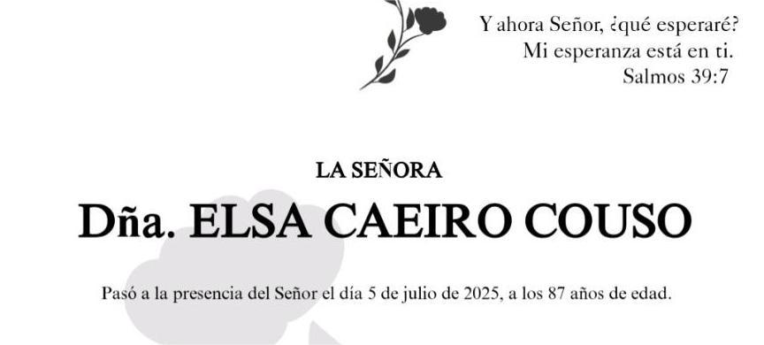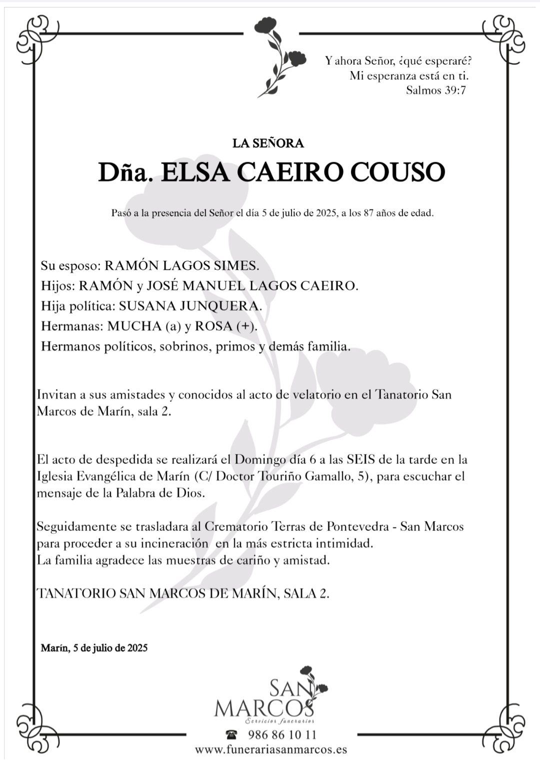 La funeraria SAN MARCOS comunica el fallecimiento hoy, día 5 de junio, de doña ELSA CAEIRO COUSO cuyos restos mortales permanecerán en el Tanatorio SAN MARCOS, de Marín, sala nº 2, hasta el momento de su traslado, MAÑANA domingo día 6 de julio, a las SEIS de la tarde a la Iglesia Evangélica de Marín para escuchar la Palabra de Dios y, seguidamente, al crematorio Terras de Pontevedra para su incineración en la intimidad familiar.