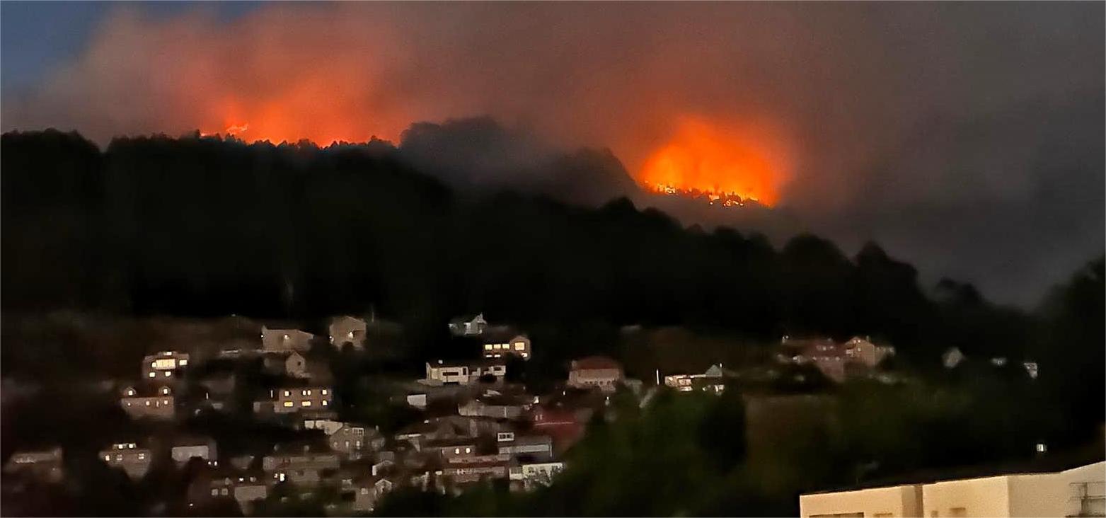Las llamas son visibles, ya en medio de la oscuridad, desde distintos puntos de Marín, y la noche se prevé muy larga para los medios de extinción que cuentan con la ventaja poder centrarse al completo en este fuego pues en este momento, es el único activo en toda Galicia.