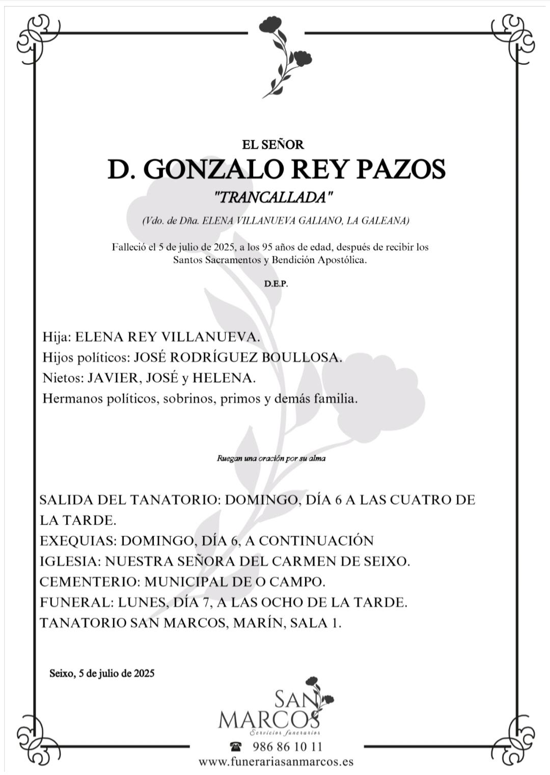 La funeraria SAN MARCOS comunica el fallecimiento hoy, día 5 de junio, de don GONZALO REY PAZOS cuyos restos mortales permanecerán en el Tanatorio SAN MARCOS, de Marín, sala nº 1, hasta el momento de su traslado, MAÑANA domingo día 6 de julio, a las cuatro de la tarde a, para su inhumación en el cementerio municipal de O Campo .