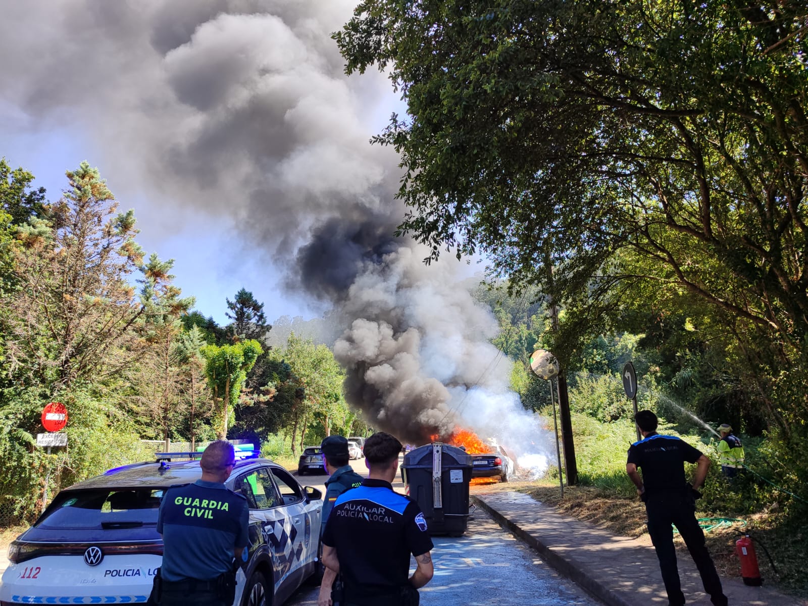 Policía Local, Nacional y Guardia Civil se encuentran en el lugar del suceso junto con el equipo de socorristas que fueron, al parecer, los primeros en llegar al fuego que, en este momento ha remitido considerablemente gracias a la llegada de los Bomberos de O Morrazo.