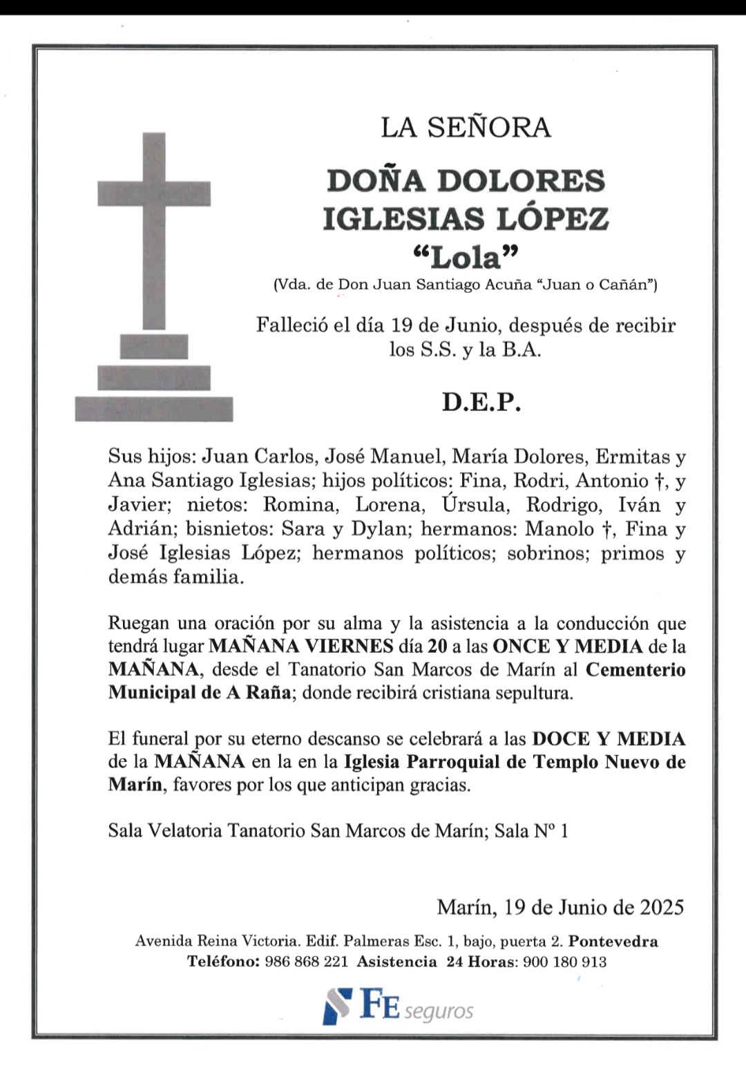La funeraria LA FE comunica el fallecimiento hoy, día 19 de junio, de doña DOLORES IGLESIAS LÓPEZ, cuyos restos mortales permanecerán en el Tanatorio SAN MARCOS, de Marín, sala nº 1, hasta el momento de su traslado, mañana viernes día 20 de junio a las once y media de la mañana al cementerio municipal de A Raña para su inhumación..