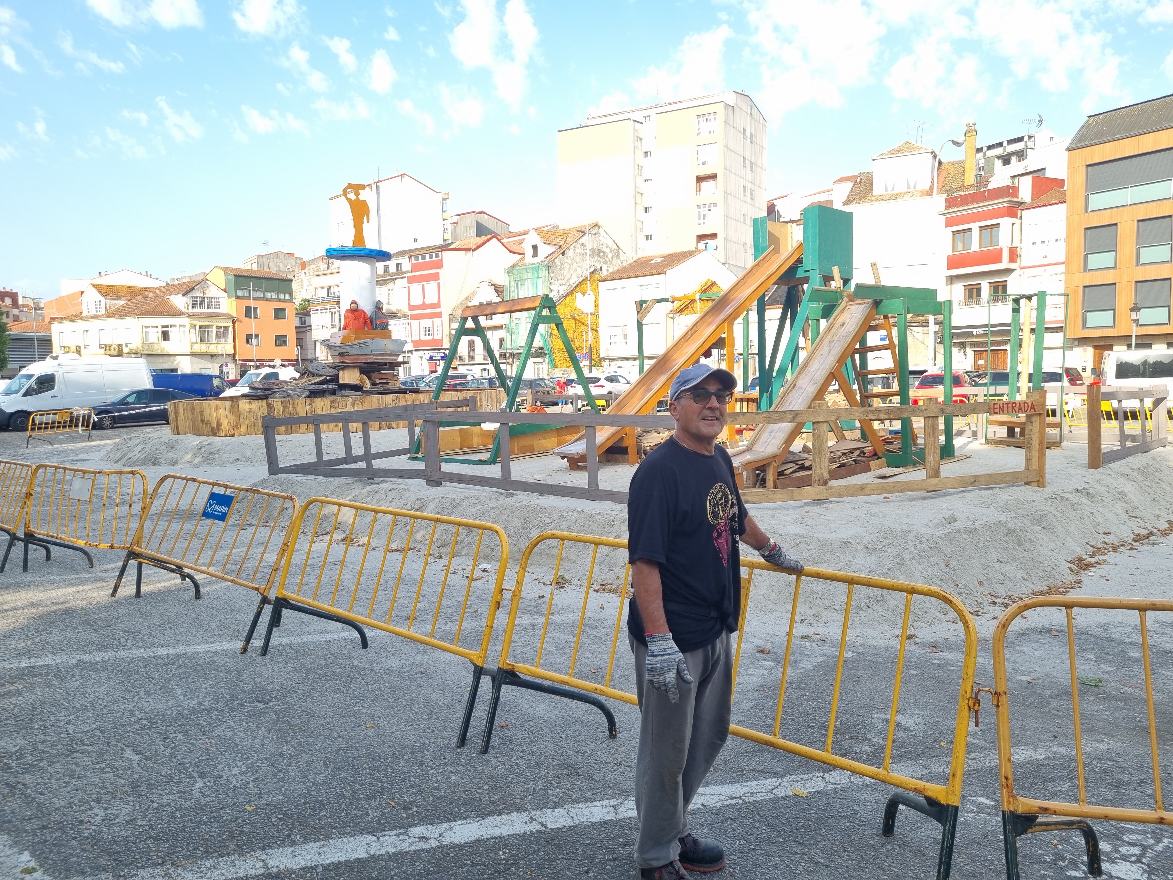 Y allí estaba el bueno de Morgan, en plena faena dando los últimos toques al montaje que es para sorprenderse porque, en el primero, el foleón de las 10, han reproducido un parque infantil con todo detalle, parque que incluso puede ser utilizado mientras no se lo traguen las llamas del día 23.