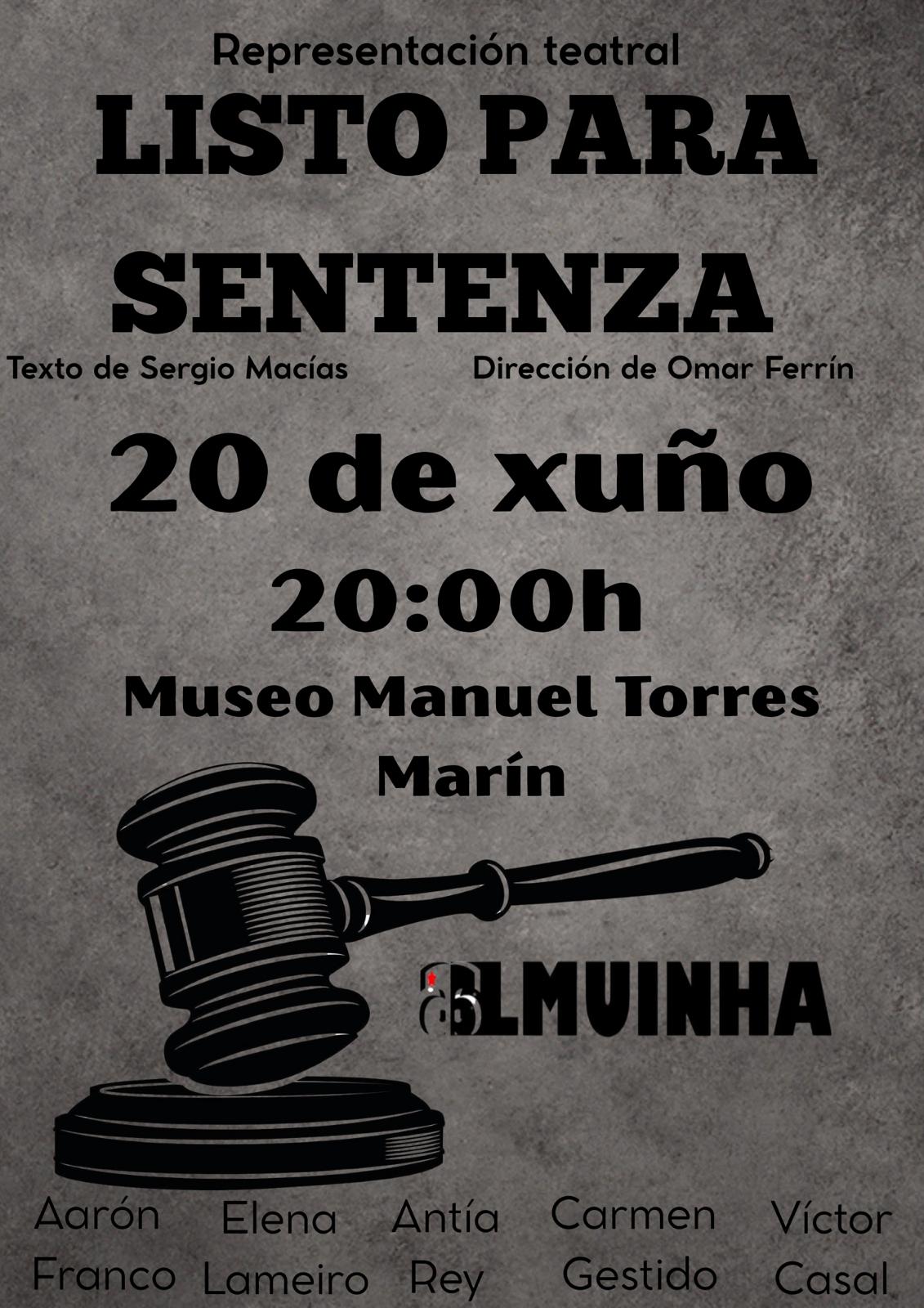 A Asociación Cultural Almuinha ten o pracer de anunciar a estrea da obra teatral Listo para sentenza, que terá lugar este venres 20 de xuño ás 20:00 h no Museo Manuel Torres de Marín. A entrada será de balde ata completar aforo.