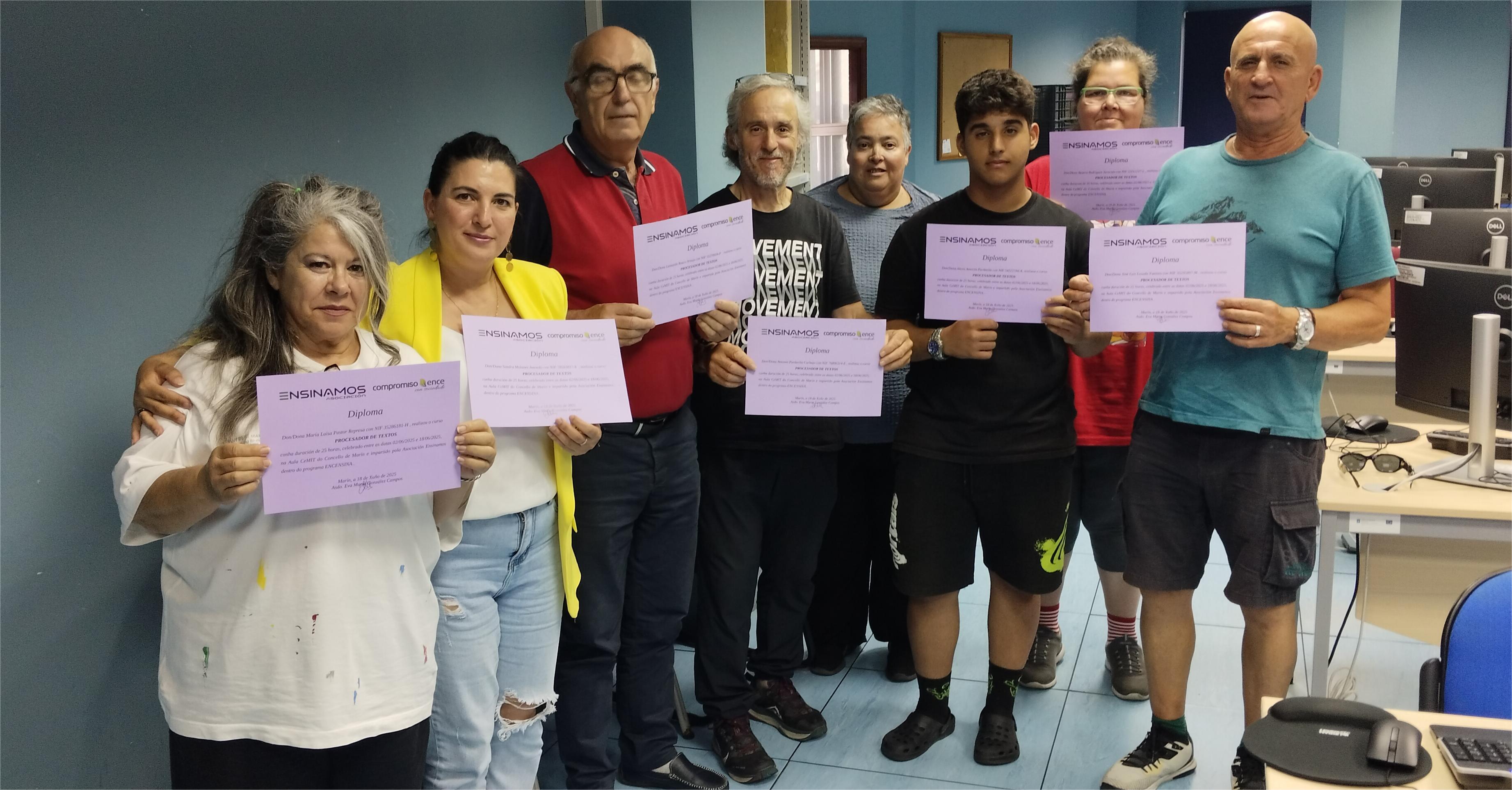 Finalizado el curso “Procesador de Textos” que organizó y ofreció la asociación “Ensinamos” con el patrocinio del Plan Social ENCE, ayer tarde se procedió a la entrega de los diplomas de aprovechamiento del mismo en el aula informática municipal ubicada en el piso superior de la Biblioteca Pública.