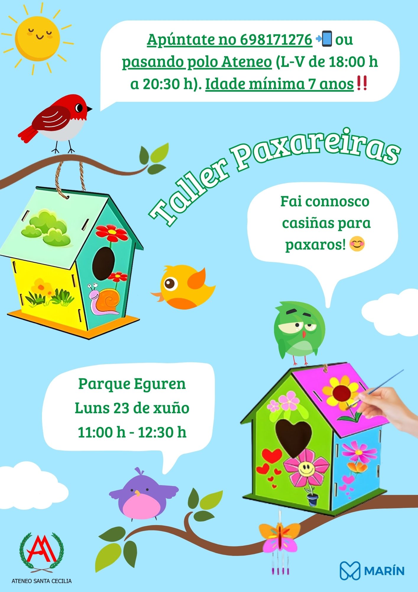 Ateneo Santa Cecilia continúa coa súa programación especial con motivo do Día Mundial do Medio Ambiente. Despois do éxito da charla “O arte do paisaxismo. Historia e estilos ao longo do tempo”, impartida por Xosé Souto, preséntase unha nova iniciativa: o “Taller Paxareiras”, que terá lugar o vindeiro luns 23 de xuño, de 11:00 h a 12:30 h, no Parque Eguren.