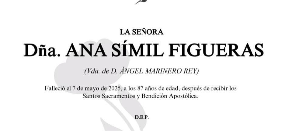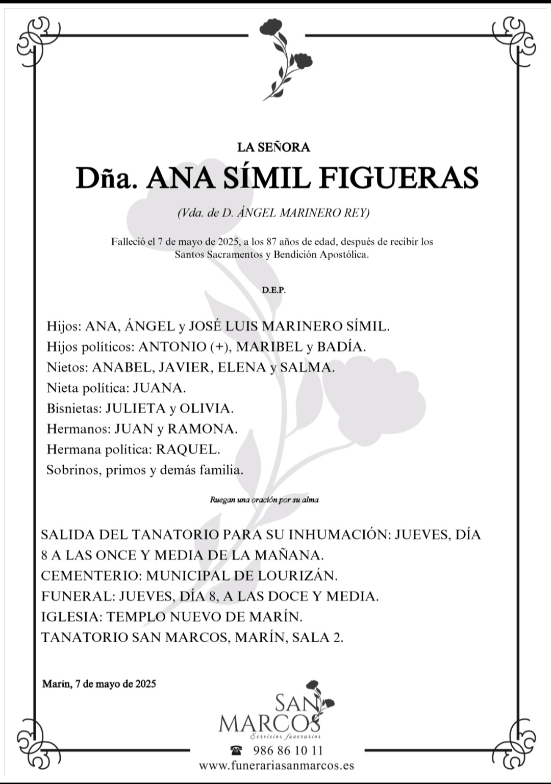 La funeraria SAN MARCOS comunica el fallecimiento hoy día 7 de mayo de doña ANA SÍMIL FIGUERAS, cuyos restos mortales permanecerán en el Tanatorio SAN MARCOS, de Marín, sala número 2 hasta el momento de su traslado, MAÑANA JUEVES día 8 de mayo a las ONCE Y MEDIA de la mañana al cementerio municipal de Lourizán para su inhumación .