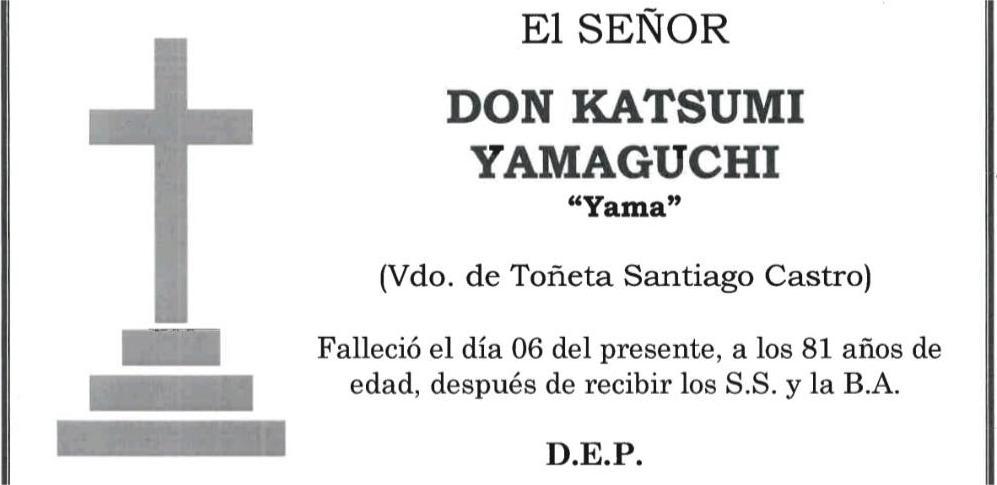 La funeraria LA FE comunica el fallecimiento ayer día 6 de mayo de don KATSUMI YAMAGUCHI cuyos restos mortales permanecerán en el Tanatorio SAN MARCOS, de Marín, sala número 1 hasta el momento de su traslado, HOY MIÉRCOLES día 7 de mayo a las NUEVE Y MEDIA DE LA TARDE al crematorio para su incineración en la intimidad familiar.