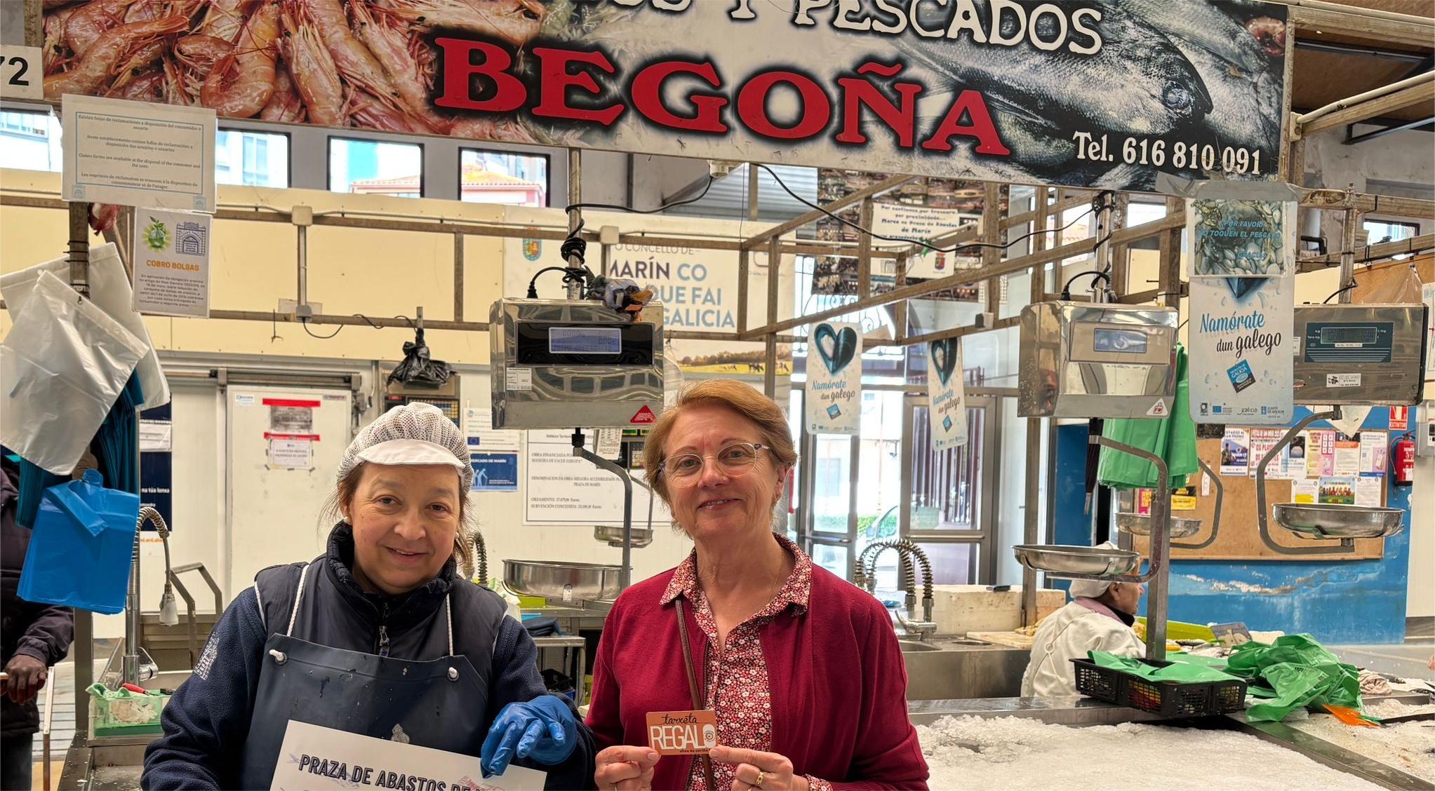 La clienta de la Plaza de Abastos, Florinda Cubelos Fernández, resultó ser la ganadora del sorteo de la campaña promocional del “Día da Nai” convocada por los vendedores de la Plaza Municipal de Abastos de Marín y en la mañana de ayer recibió su tarjeta valorada en 100 euros que le fue entregada por la titular del puesto “Mariscos y Pescados Begoña” en el que la afortunada hizo su gasto en el transcurso de la promoción, momento que recoge esta imagen.