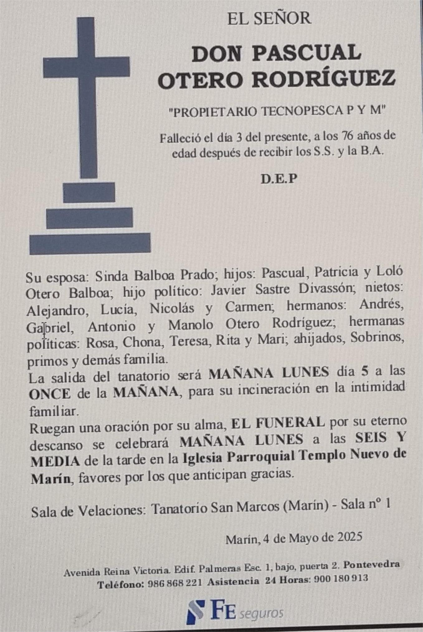 Según comunica la funeraria La Fé, los restos mortales de Pascual se velan en el Tanatorio San Marcos de Marín, sala número 1 de donde saldrán mañana lunes, día 5 a las once para su incineración en la intimidad familiar y, la Misa por su alma, tendrá lugar en el Nuevo Templo de Marín a las seis y media de la tarde