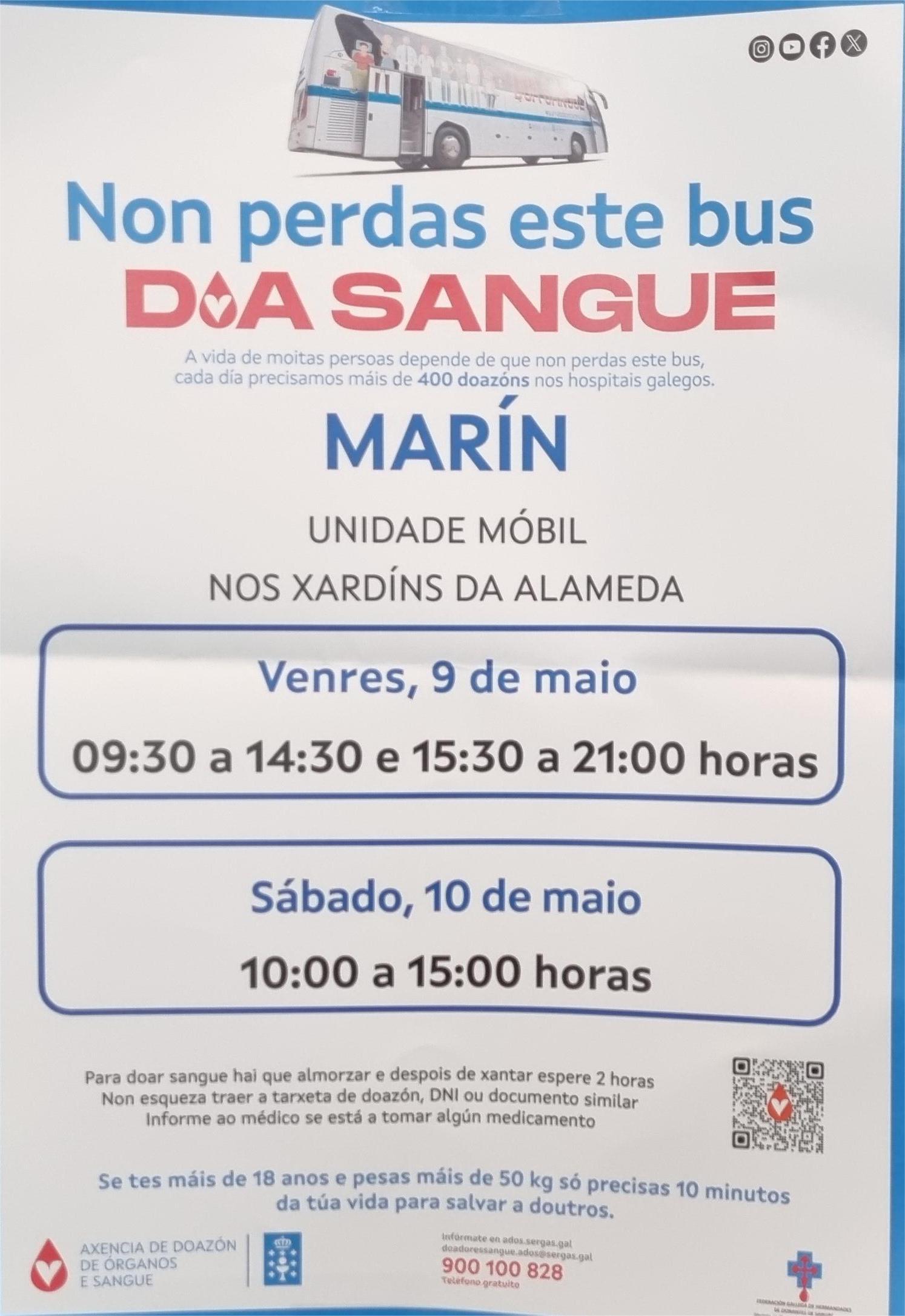 El viernes, en horario matinal de nueve y media a dos y media y, de tres y media a nueve, por la tarde, y el sábado solamente de 10 a 15 por la mañana, será el tiempo de estacionamiento del autobús en la alameda marinense a la espera de los donantes.