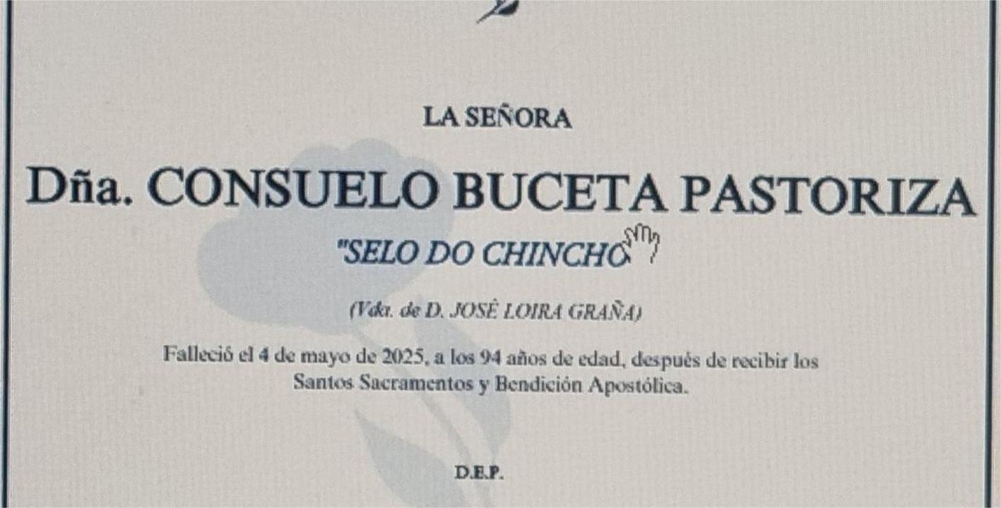 La funeraria SAN MARCOS comunica el fallecimiento hoy día 4 de mayo de Dña. CONSUELO BUCETA PASTORIZA cuyos restos mortales permanecerán en el Tanatorio SAN MARCOS, de Marín, sala número 2 hasta el momento de su traslado, MAÑANA LUNES día 5 de mayo a las seis de la tarde para su inhumacióm en el cementerio municipal de Ardán .