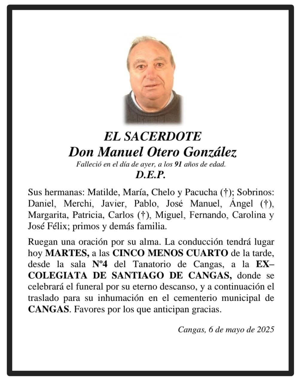 Asimismo comunica que el funeral por su alma será también mañana martes día 6, a las seis menos cuarto en la iglesia parroquial de San José de Cantodarea. D.E.P.