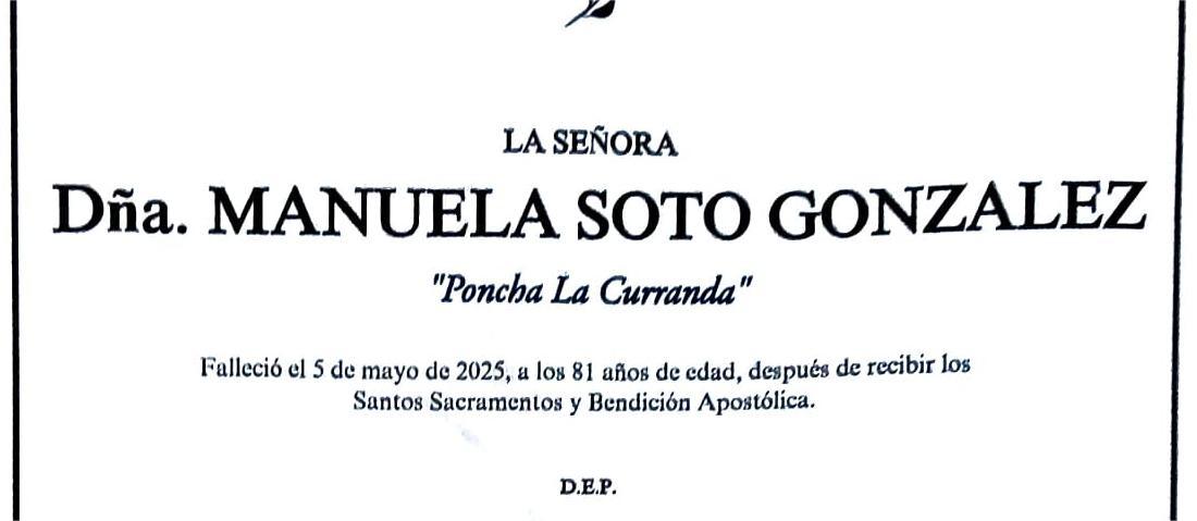 La funeraria SAN MARCOS comunica el fallecimiento hoy día 5 de mayo de Dña. MANUELA SOTO GONZÁLEZ cuyos restos mortales permanecerán en el Tanatorio SAN MARCOS, de Marín, sala número 2 hasta el momento de su traslado, MAÑANA MARTES día 6 de mayo a las CINCO de la tarde para su inhumacióm en el cementerio municipal de A Raña .