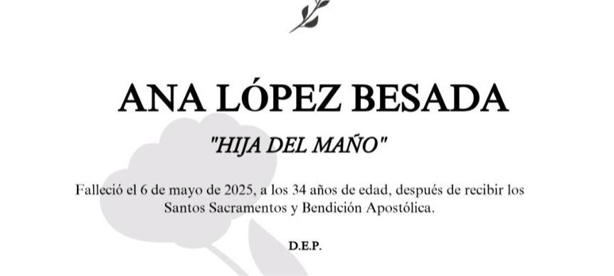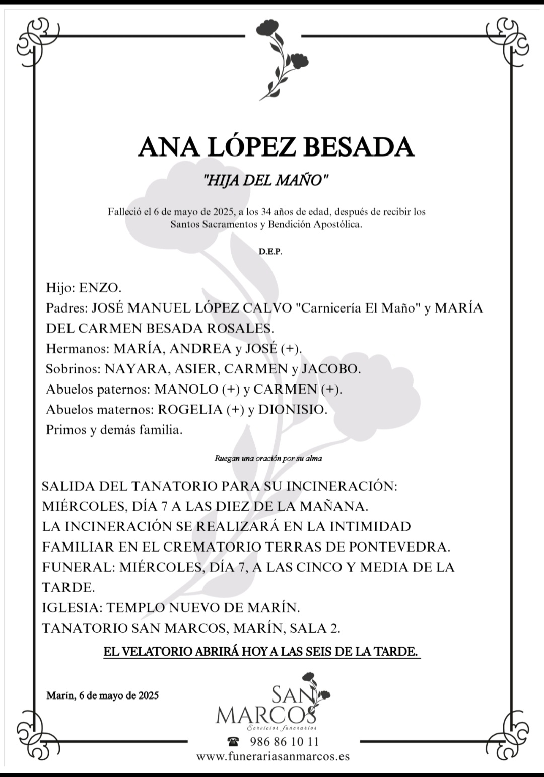 La funeraria SAN MARCOS comunica el fallecimiento hoy día 6 de mayo de la joven ANA LÓPEZ BESADA, hija de José Manuel y Carmen, (Carnicería El Maño”) cuyos restos mortales permanecerán en el Tanatorio SAN MARCOS, de Marín, sala número 2 hasta el momento de su traslado, MAÑANA MIÉRCOLES día 7 de mayo a las DIEZ de la mañana al crematorio Terras de Pontevedra para su incineración en la intimidad familiar. El velatorio abrirá esta tarde a las seis