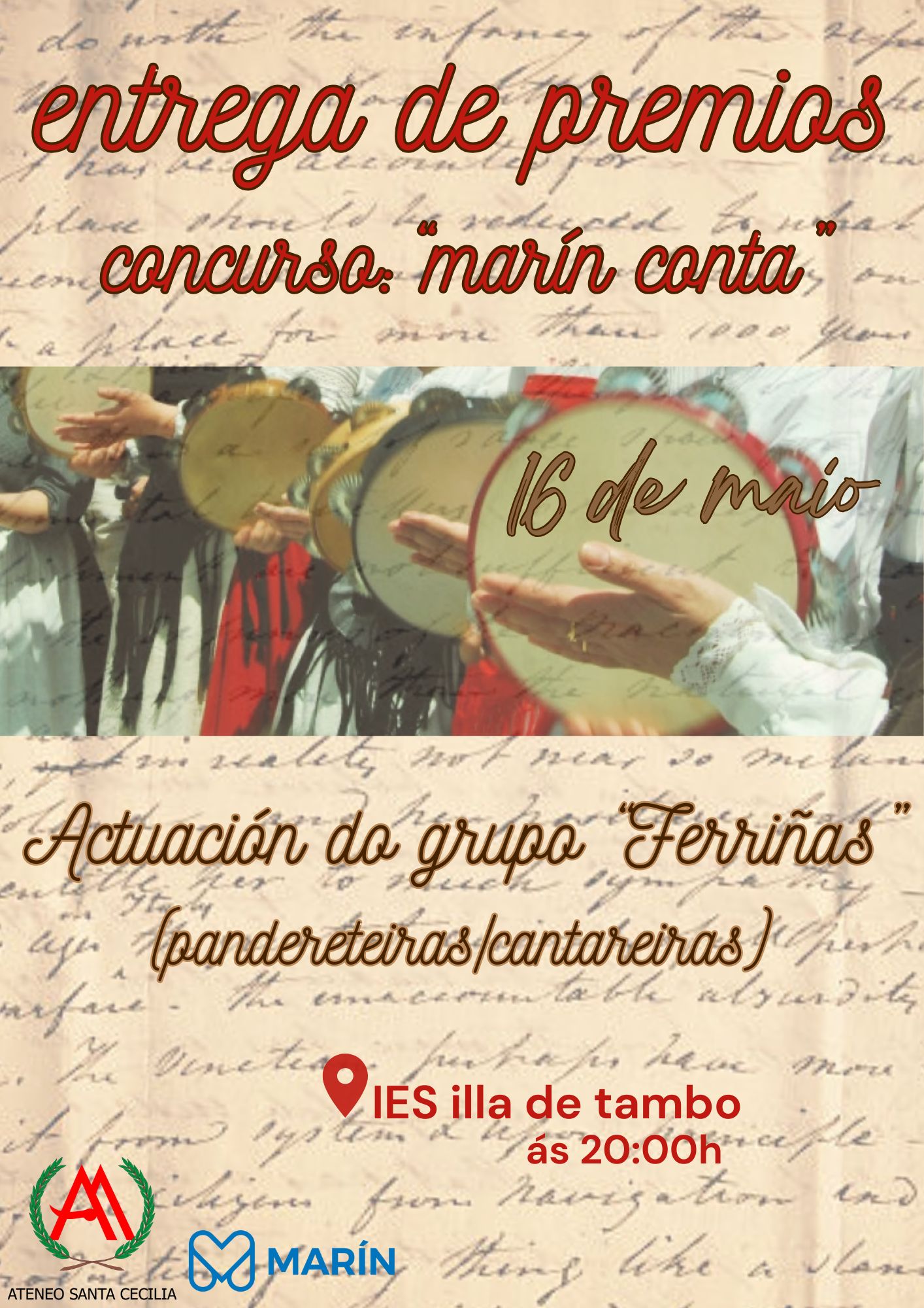 O Ateneo Santa Cecilia organiza este ano un acto especial para celebrar o Día das Letras Galegas na data víspera do 17 de maio cun concerto no que intervirá a agrupación “Ferriñas” (pandereteiras e cantareiras) e no transcurso do cal farase entrega dos promios do concurso literario convocado polo propio Ateneo “Marín Conta”.