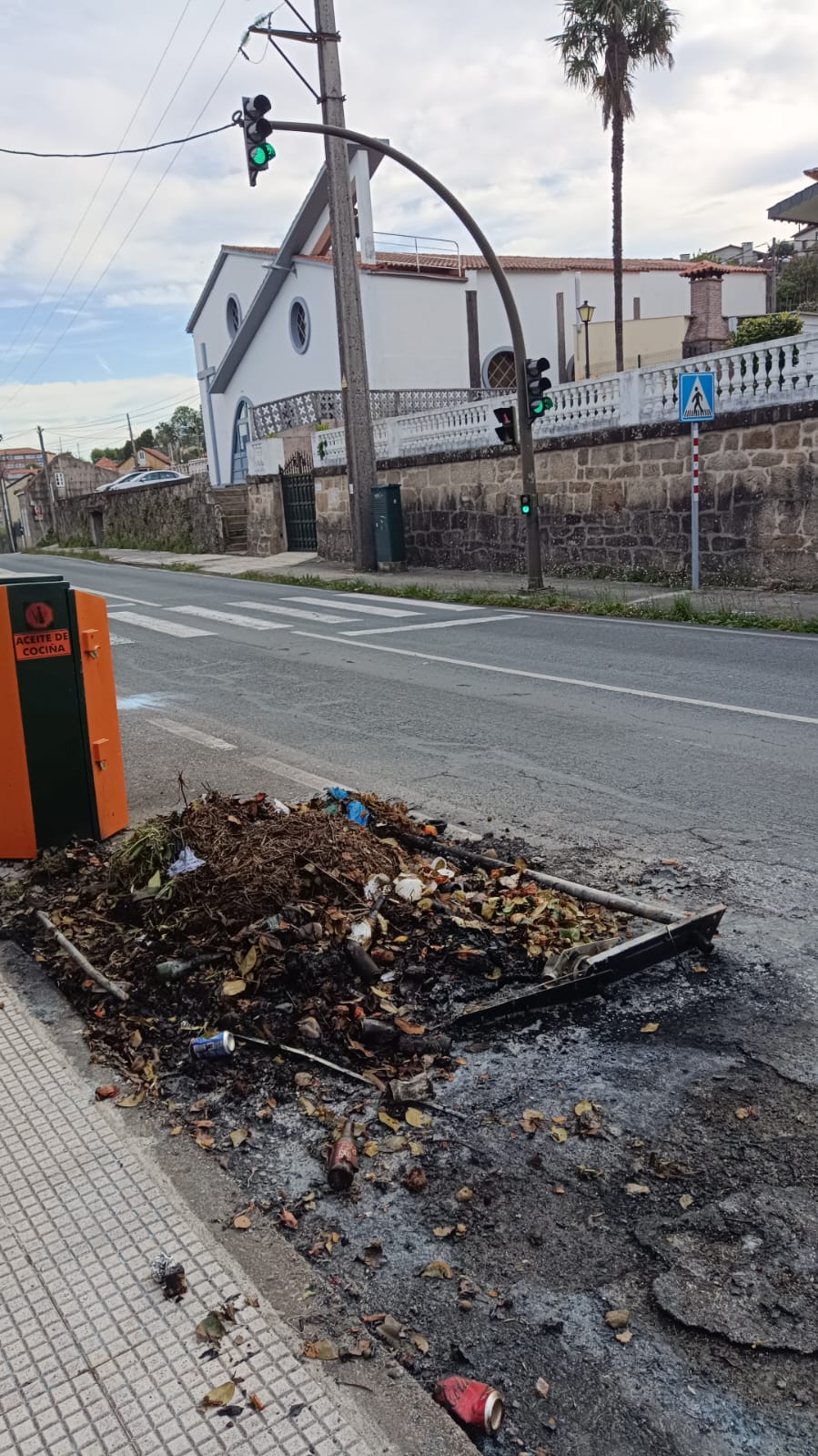 Los vándalos no descansan. Aprovechan cualquier momento y cualquier situación para efectuar sus acciones, cuyas consecuencias terminamos pagando todos los ciudadanos, y esto fue lo que pasó en la parroquia de Mogor esta madrugada: aprovechando la oscuridad provocado por el apagón general que comenzó a mediodía de ayer lunes, fueron quemados de manera intencionada cinco contenedores en la barriada de Mogor, otro delante de la iglesia y una pequeña máquina de asfaltado que se encontraba trabajando estos días en la zona de Monte de Mogor.