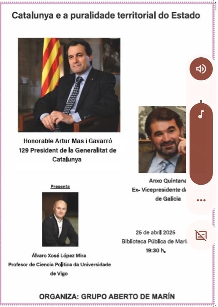 Organizado por el “Grupo Aberto de Marín”, el próximo día 25 de abril tendrá lugar un acto en la Biblioteca Pública "Vidal Pazos" que contará con la presencia del expresidente de la Generalitat de Cataluña, Artur Mas i Gavarró a quien acompañarán el ex-vicepresidente de la Xunta de Galicia Anxo Quintana y el profesor de Ciencia Política de la Universidd de Vigo Álvaro Xosé López Mira.