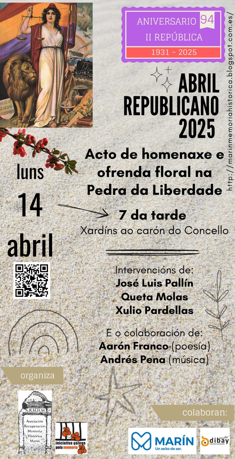 Este luns, día 14 de abril, a ARMH de Marín organiza, como cada ano, o acto para conmemorar o 94 aniversario da II República coa homenaxe e ofrenda floral na Pedra da Liberdade, nos xardíns ao carón do Concello.