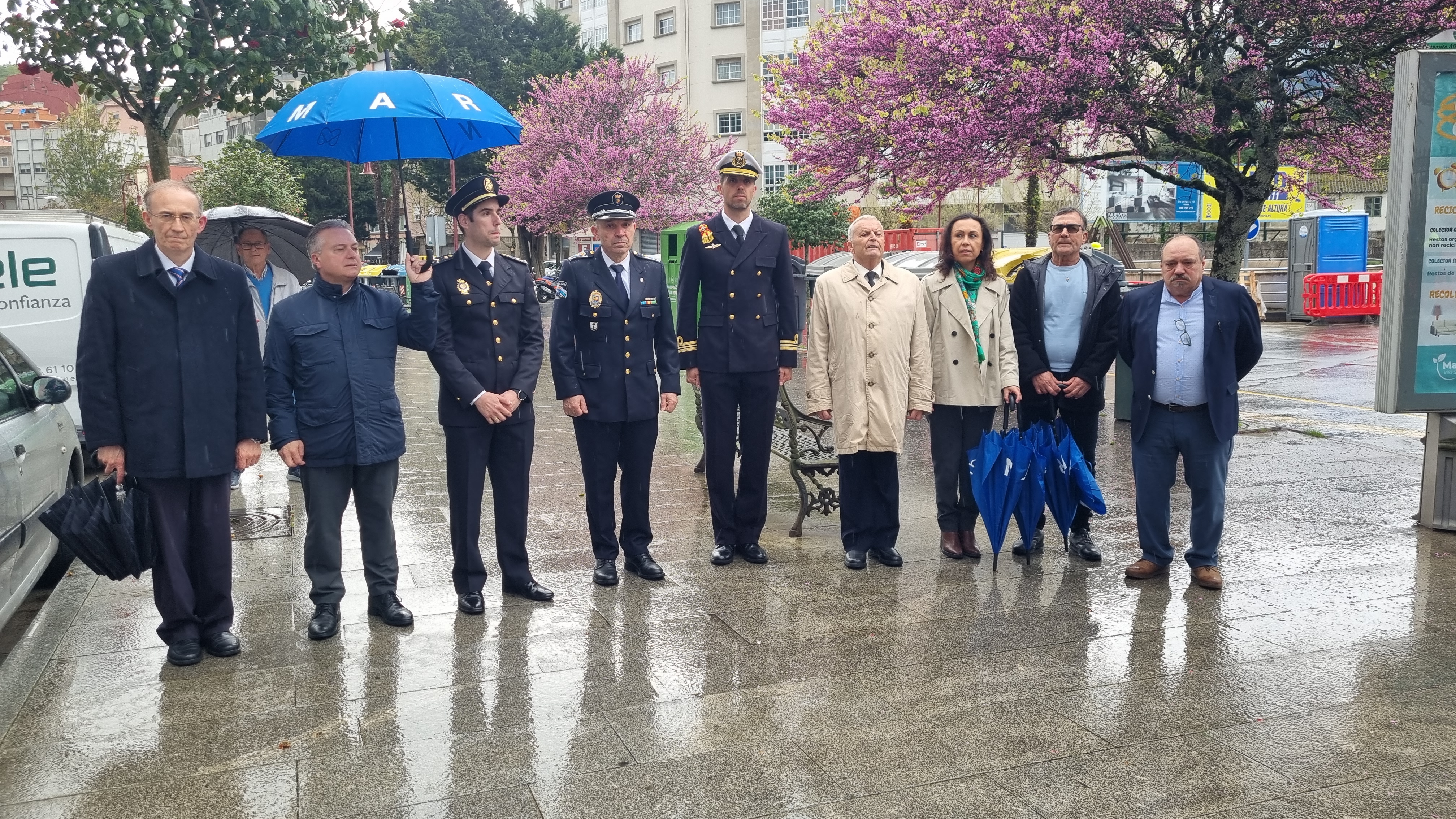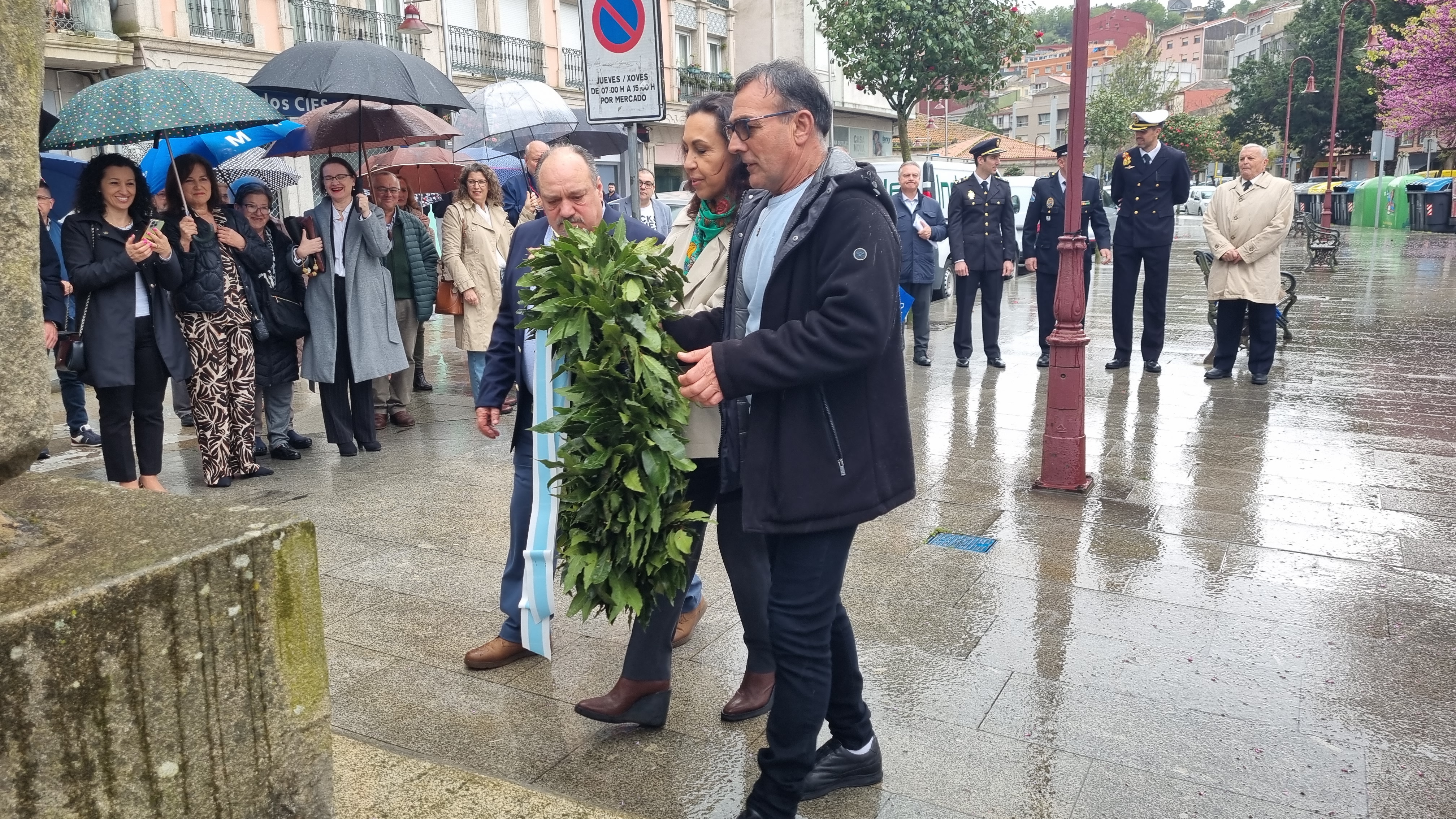 Autoridades bajo la lluvia mientras sonaba el Himno Galego