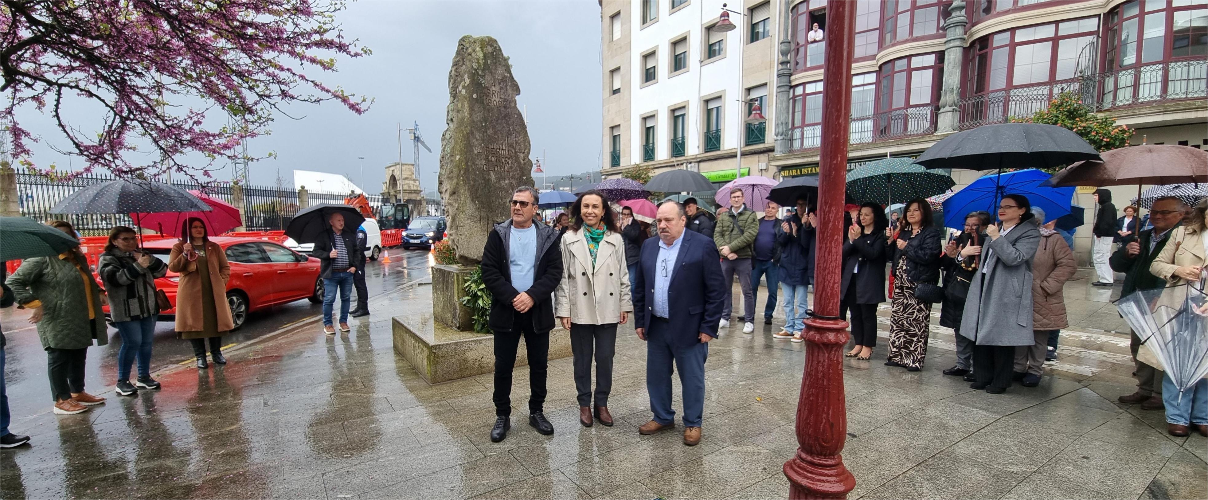 Ante el monolito ubicado muy cerca de donde estuvo el “Fuerte de San Fernando” del que los marinenses expulsaron a las tropas francesas en la madrugada del 4 de abril de 1809 se inició ayer tarde la ceremonia del Día de la Liberación. Mienras “Os Chaneiros” interpretaban varias piezas y entre ellas como colofón el “Himno Galego” se depositó la corona de laurel a los pies del monolito momento protagonizado por la alcaldesa María Ramallo flanqueada por “Chicho” y “Morgan”, los dos homenajeados junto a los miembros de la asociación “Amijos e Visiños do Cantodarea”.
