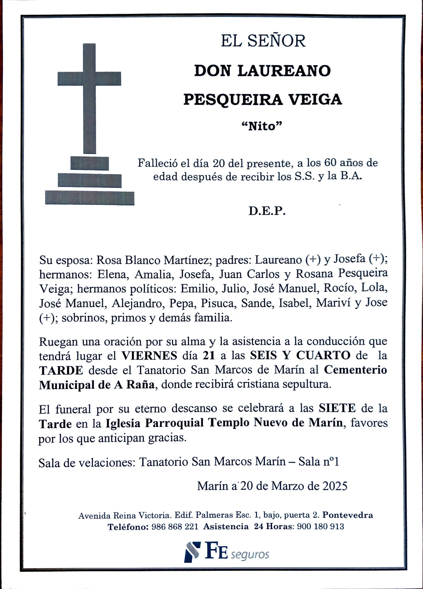 La funeraria LA FE comunica el fallecimiento HOY día 20, de don LAUREANO PESQUEIRA VEIGA cuyos restos mortales permanecerán en el Tanatorio SAN MARCOS, de Marín, sala nº 1 hasta el momento de su traslado, mañana viernes día 21 de marzo a las seis y cuarto de la tarde desde el tanatorio al cementerio municipal de A Raña para su inhumación .