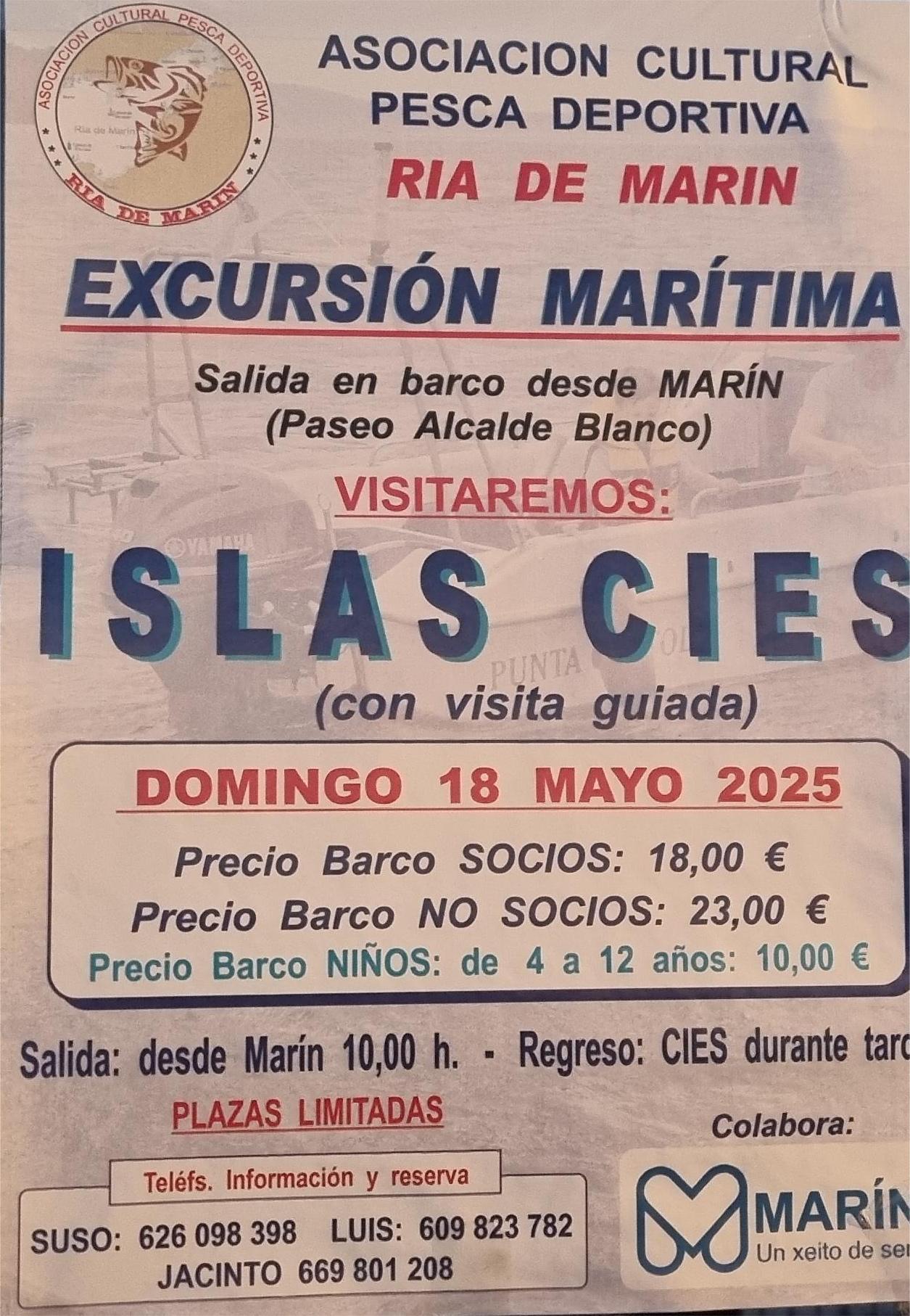 La asociación “Ría de Marín”, cultural y de pesca deportiva, ha programado una excursión marítima a las Islas Cíes con la particularidad de que la salida de este singular viaje será desde el paseo marítimo Antonio Blanco Solla, a las diez de la mañana del domingo día 18 de mayo.
