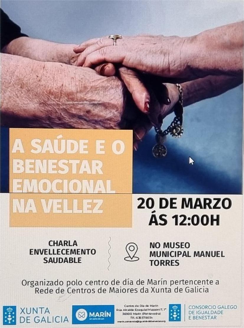 Pasado mañá, xoves, día 20 terá lugar no salón de actos do Museo Torres unha nova charla promovida polo Centro de Día de Marín sobre o tema “A Saúde e o benestar na vellez”, dentro do programa de charlas que a entidade ten previsto no proxecto “Charlas de Envellecemento Saudable”.