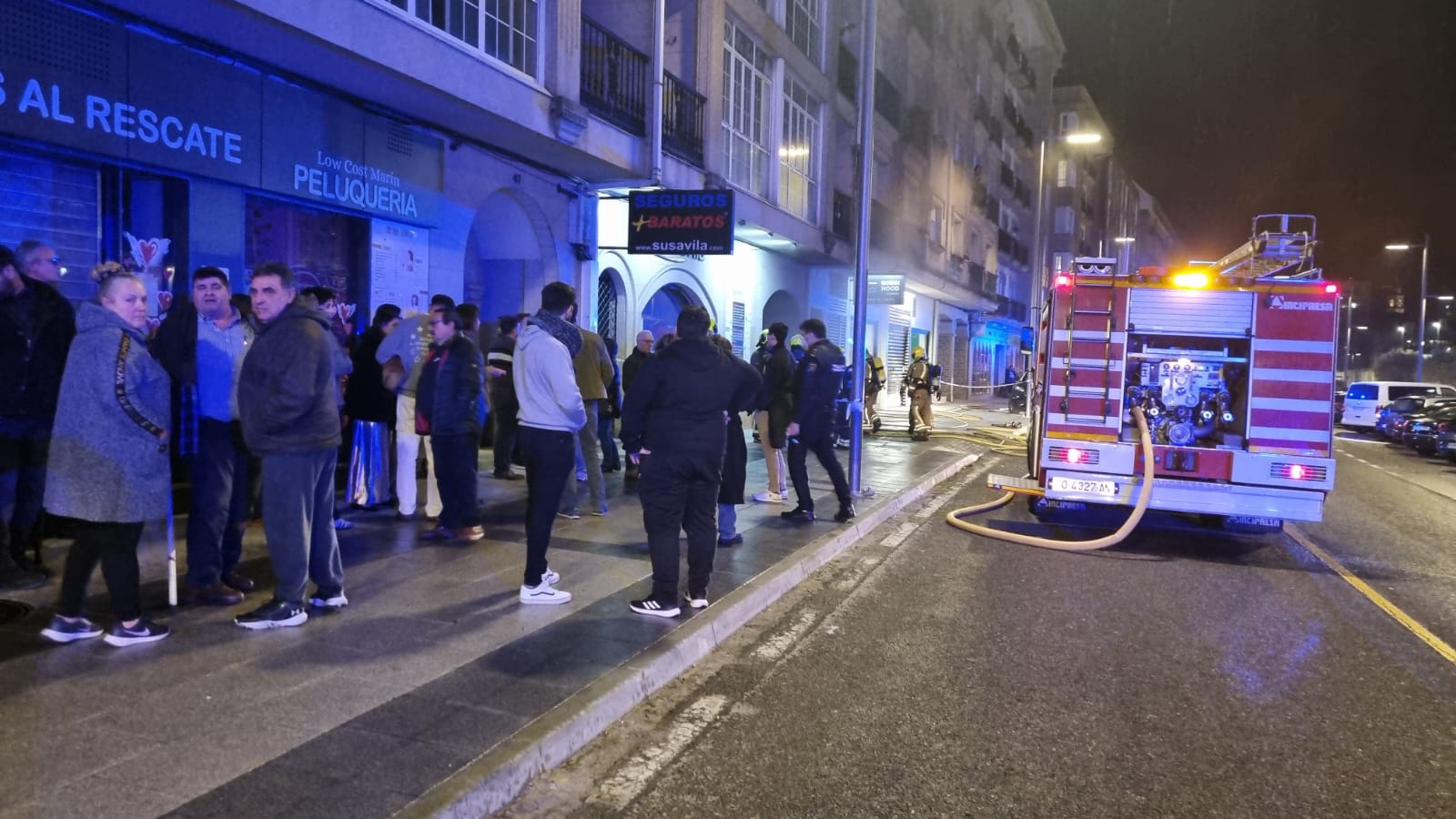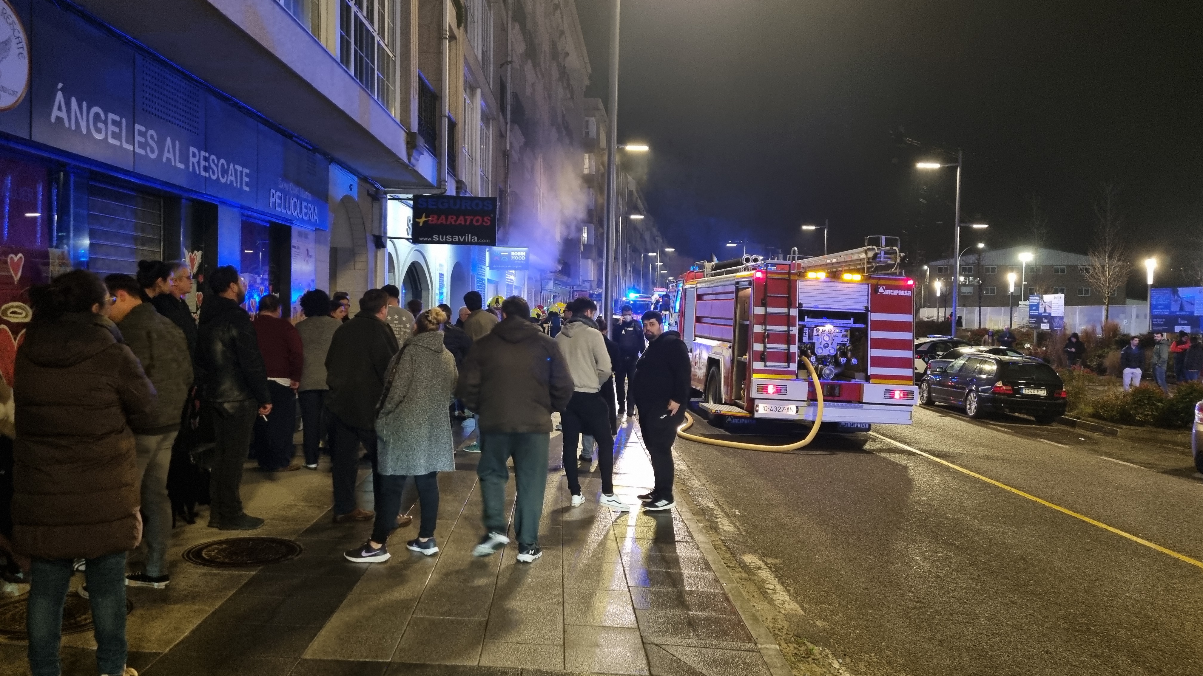 Desde el mismo punto de incidente informaba Carriola en la noche de ayer del incendio acaecido en el garaje del edificio 47 en la calle Avenida de Ourense. En aquel momento, antes de las diez de la noche, los vecinos estaban en la calle alertados por el peligro de los gases despendidos de la humareda mientras un espeso humo negro emanaba de la entrada del garaje.