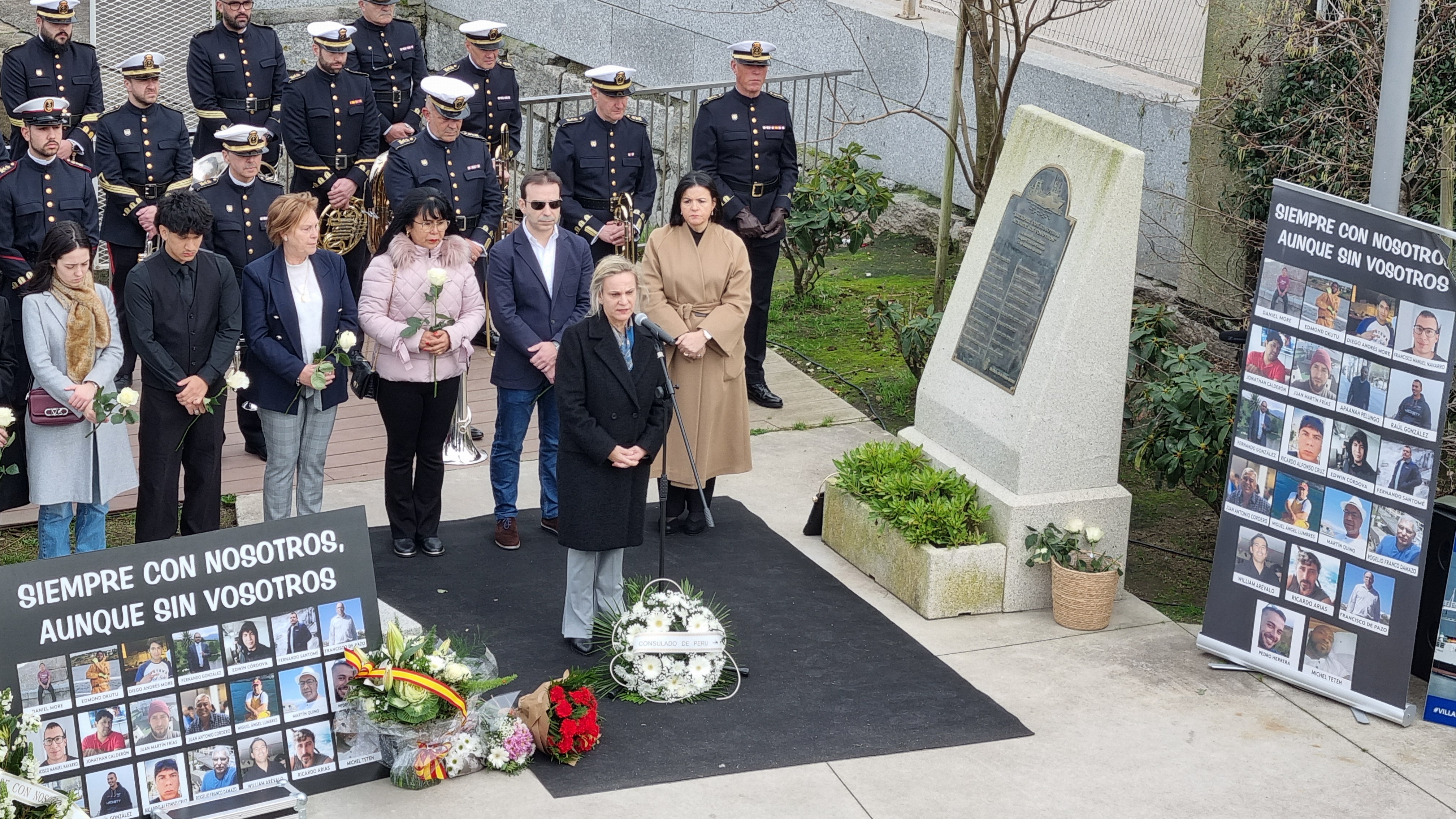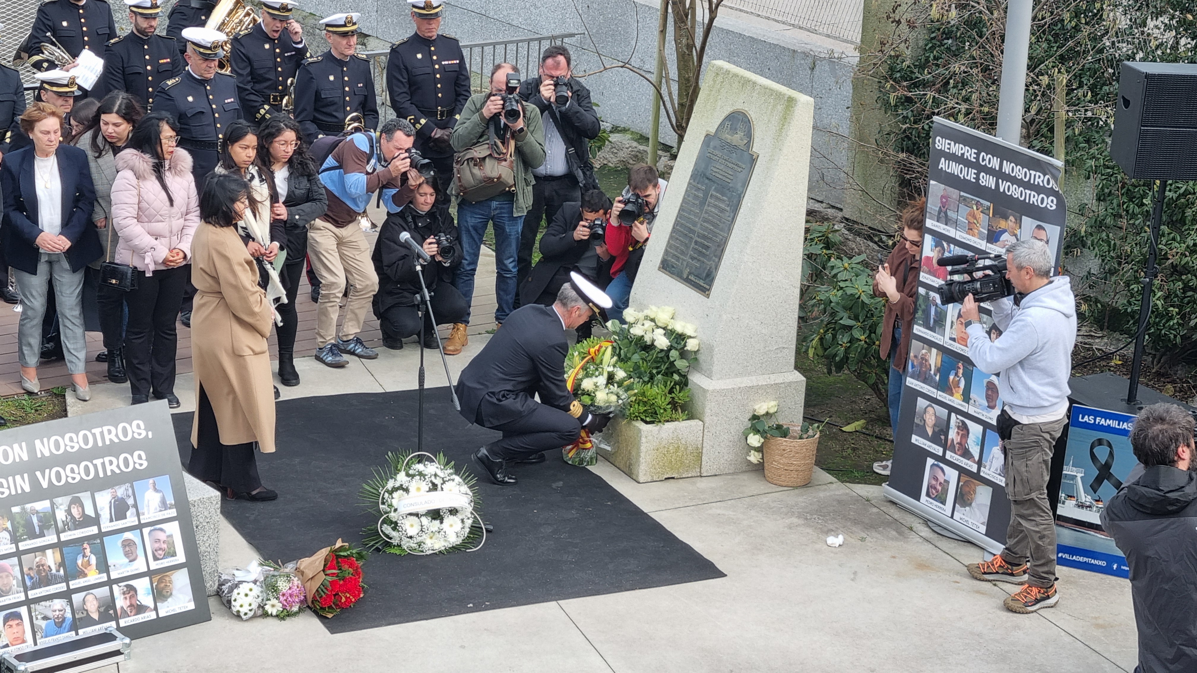 La placa monumental que contiene los nombres de los 21 náufragos del Villa de Pitanxo en el Paseo Marítimo Alcalde Blanco Solla, acogió ayer el homenaje de recuerdo que, por tercer año consecutivo han hecho los familiares de los 21 marineros fallecidos a causa del naufragio ocurrido aquel aciago día 15 de febrero de 2022, accidente que sigue siendo investigado y lo será durante otros seis meses porque al juzgado correspondiente no le bastan todavía los informes que existen sobe el caso entre los que está la bajada del artilugio que filmó el estado del pecio y sus aparejos.
